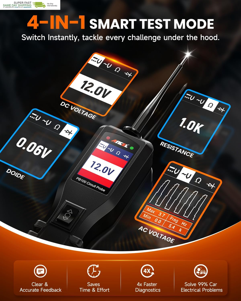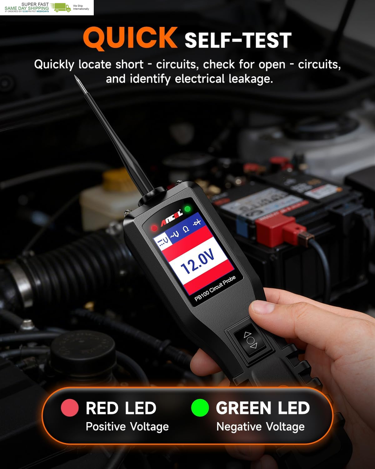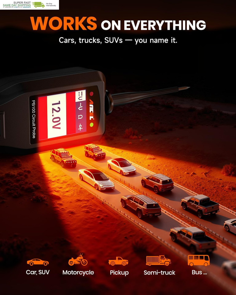 Trusted by DIYers and mechanics alike, the ANCEL PB100 delivers pro-grade performance with its proven toughness, and dead-on accuracy. Just plug, press, and probe to solve 99% of electrical gremlins - from dead batteries to faulty trailer lights and relays. Hit 'Buy Now' to get your complete kit!