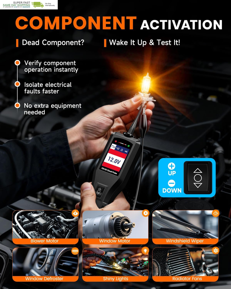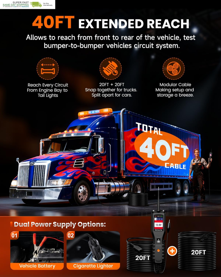 Test entire vehicles without moving - our 40ft reach accesses everything from engine bays to trailer lights. One tool replaces your multimeter, test light, jumper wires, and fuse tester. Dual-power means no more dead tester drama, while the built-in circuit breaker prevents costly mistakes.
