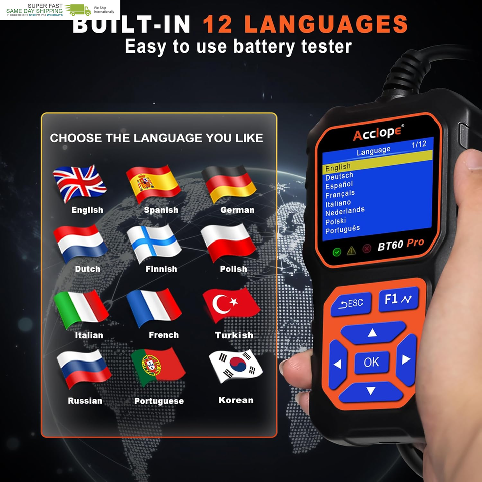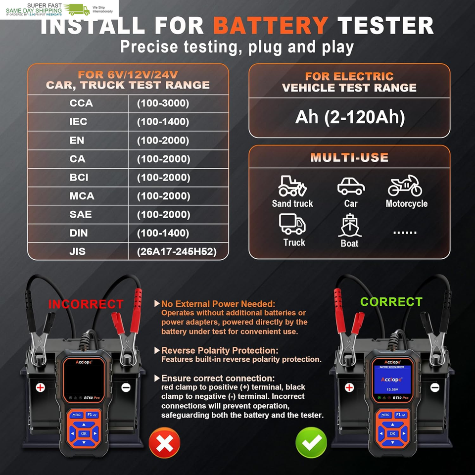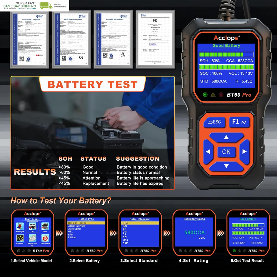 Acclope BT60 Pro offers advanced battery testing, reverse polarity protection, and non-destructive testing. Its high-contrast LCD ensures clear visibility, even in bright sunlight, making it reliable for all environments.