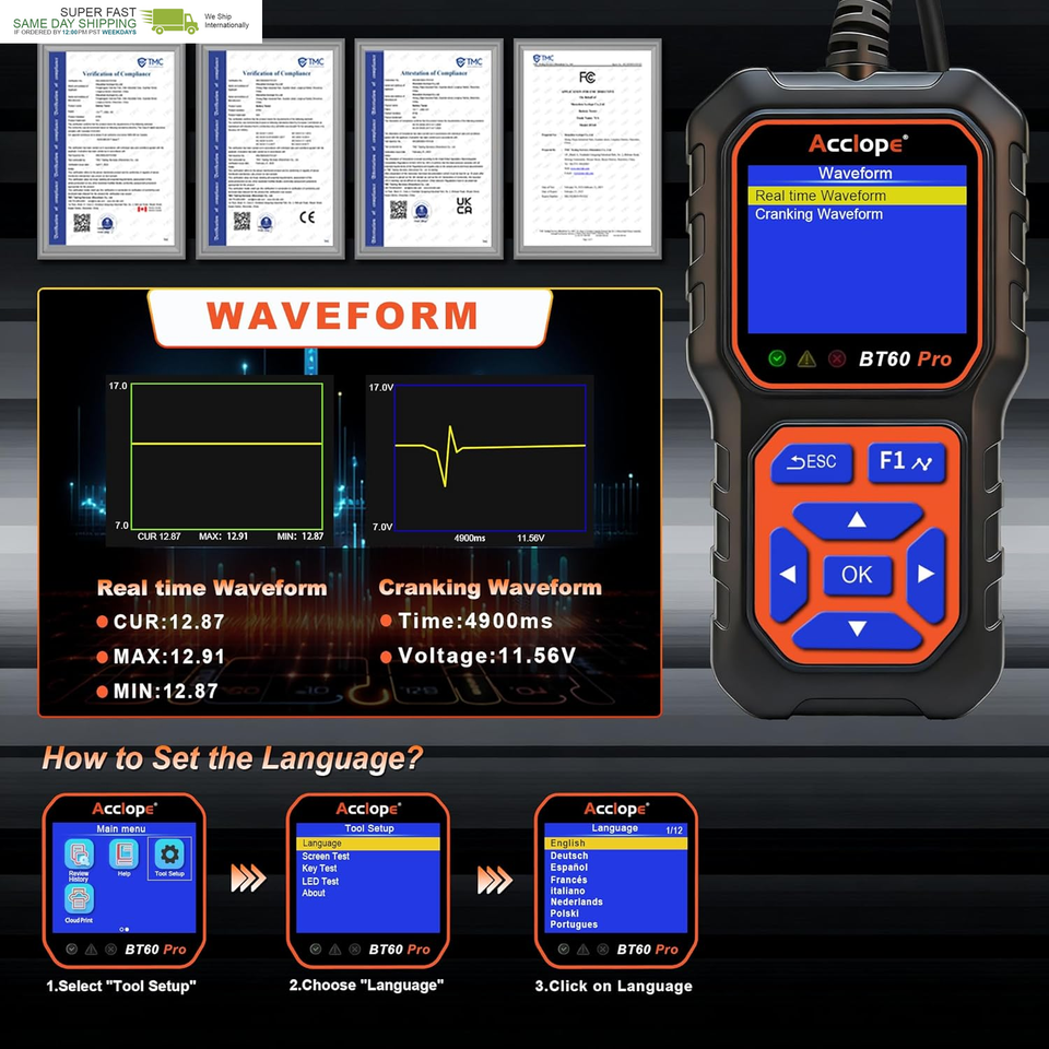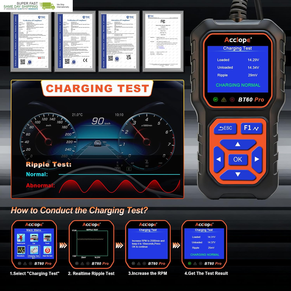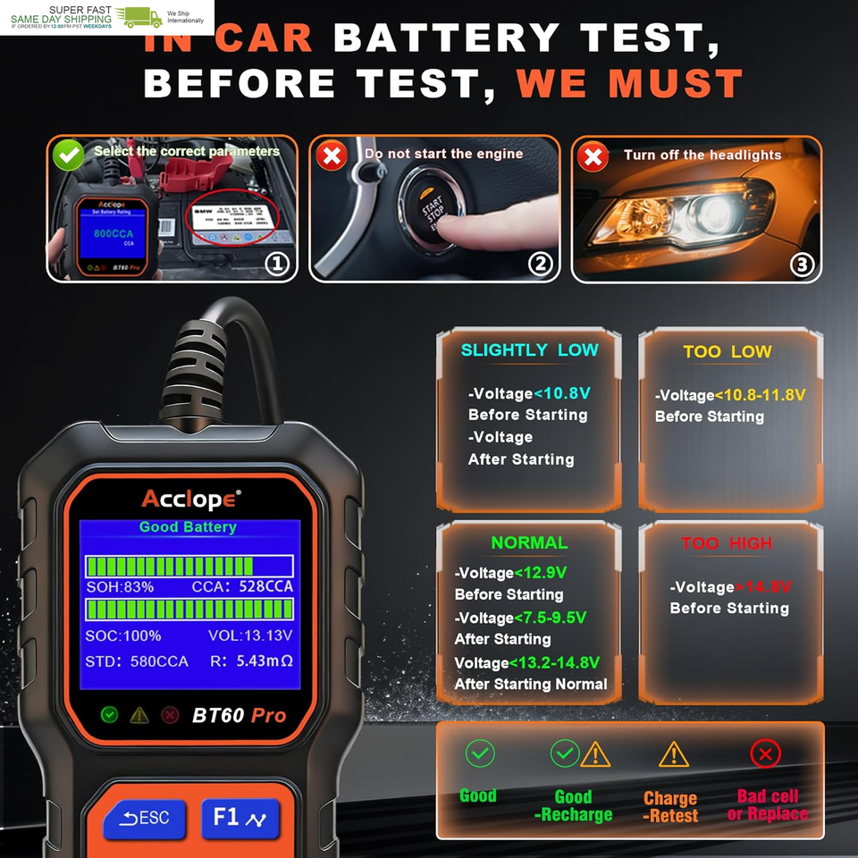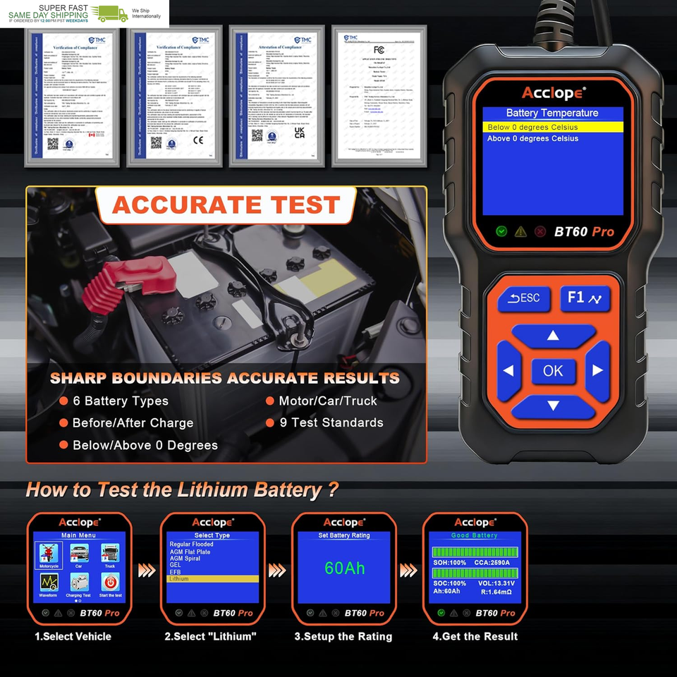 Acclope BT60 Pro offers advanced battery testing, reverse polarity protection, and non-destructive testing. Its high-contrast LCD ensures clear visibility, even in bright sunlight, making it reliable for all environments.