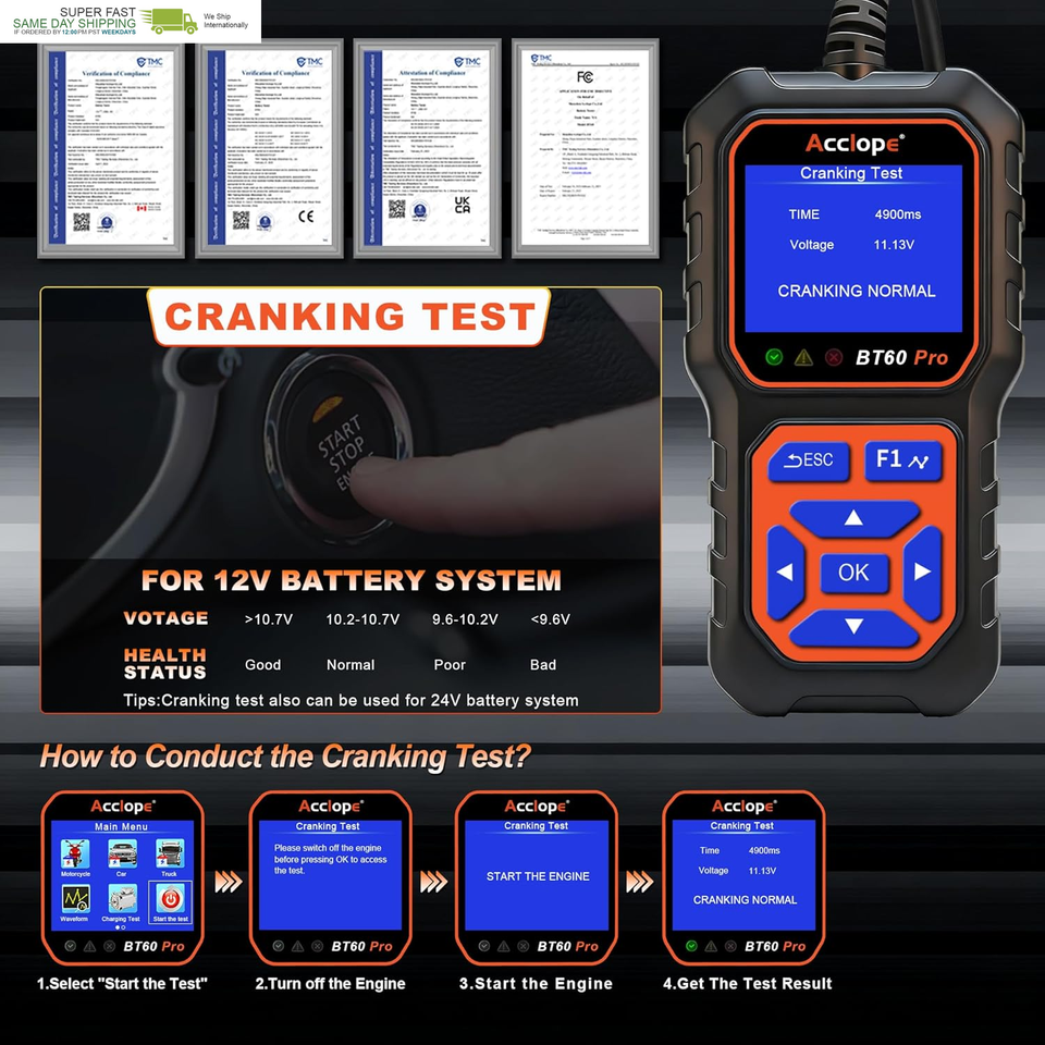Durable and Ergonomic Design: Built with a shock-resistant ABS casing and anti-slip grip, the BT60 PRO is a robust battery tester 12V automotive tool. Its long cable allows easy use in tight spaces, making it ideal for testing car batteries, 6V motorcycle batteries, and 24V truck batteries. The ergonomic design ensures comfort during extended testing sessions.