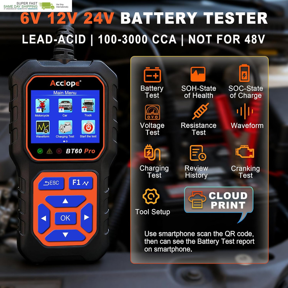 Wide Battery Compatibility: The ACCLOPE BT60 PRO supports 6V, 12V, and 24V batteries, including lead-acid, AGM, GEL, EFB, and lithium batteries. LiFePO4 support is limited to voltage/health checks and does not guarantee precise CCA measurement. The device is not compatible with 48V systems. This versatile car battery tester provides reliable diagnostics for professionals and DIY users, making it an essential tool for diverse battery testing needs.