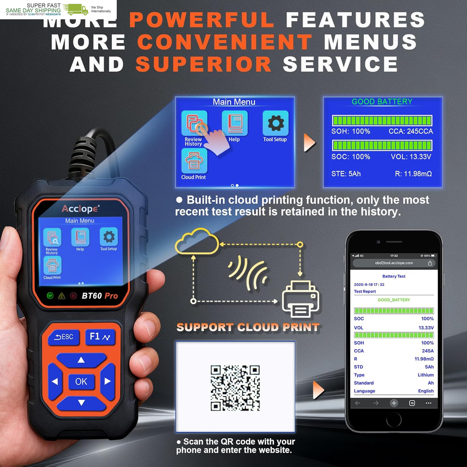 Global Support and Advanced Memory Function: Supporting 12 languages, the BT60 PRO is compatible with batteries ranging from 100CCA to 3000CCA. Its memory function stores recent test results, while QR code sharing enables personalized record-keeping. This versatile car battery tester is designed for worldwide use and enhances predictive maintenance capabilities.