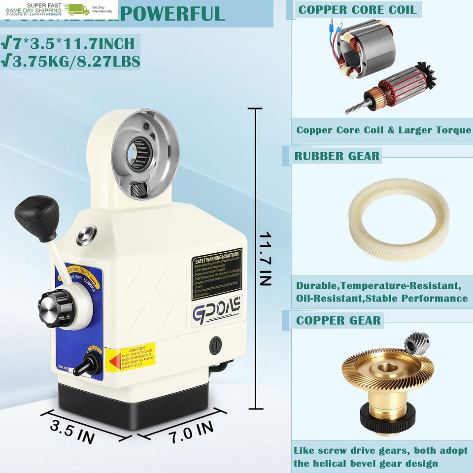 BASIC PARAMETERS: GPOAS Z-Axis power feed is made of aluminuml;Power Parameter:90Watt,110V input voltage,50/60Hz,single phase;Rotate Speed:0-200 RPM.Max Torque:450in-lb;Max feed rate: 650mm/min; Max return speed: 850mm/min.This power feed fits some milling machines like Bridgeport, Precision Matthews, Enco, Jet, Sharp, Acer, Webb, etc.
