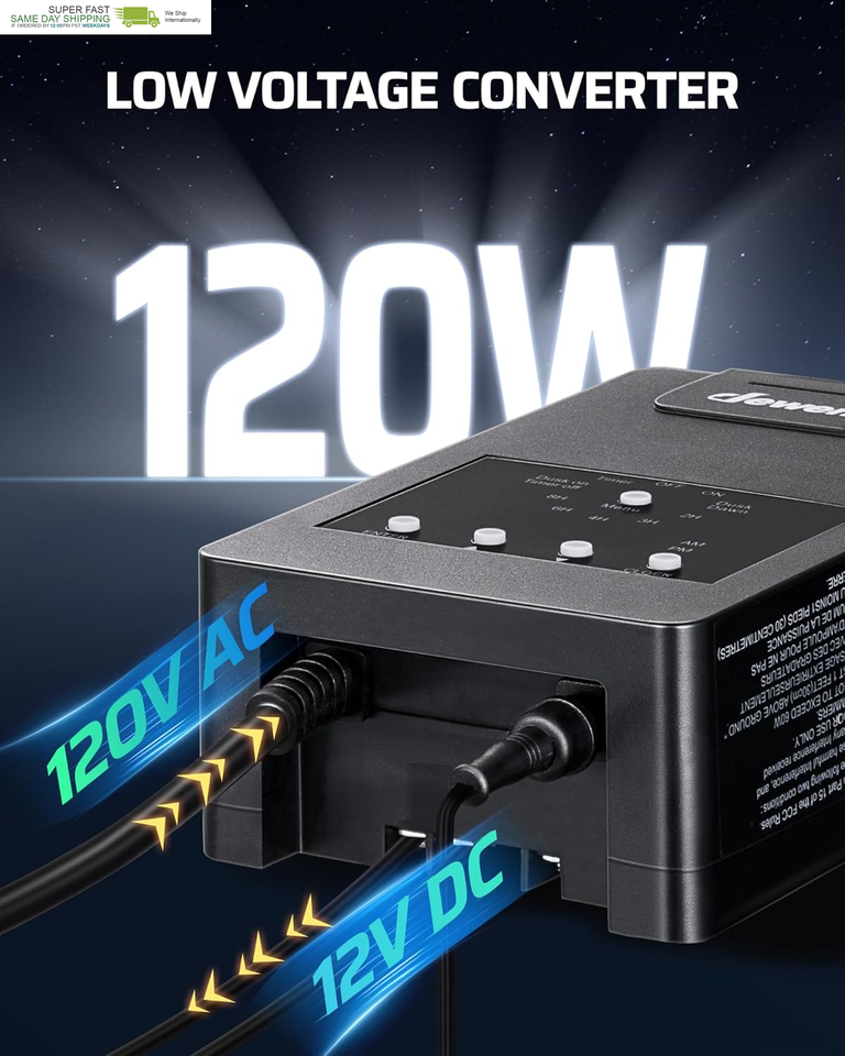 [Wide Application] The DC transformer is ideal for 12V direct current lights (Max.120W) and can be used in LED landscape lights, spotlights, garden lights, pathway lights, yard lights, deck lights, garage lights, etc