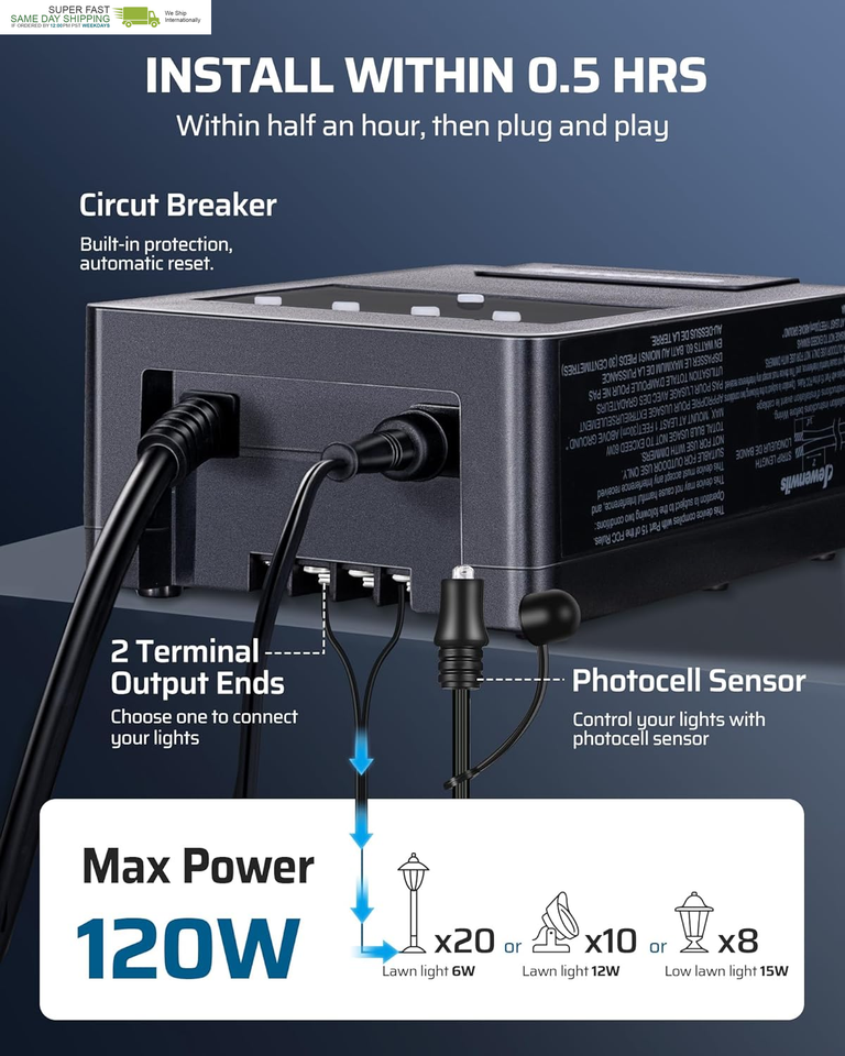 [Easy to Install] This landscape lighting transformer is very easy to install in a few minutes with a built-in hanging hole and other necessary accessories; just connect the positive and negative poles and drive 2 nail to hang it up