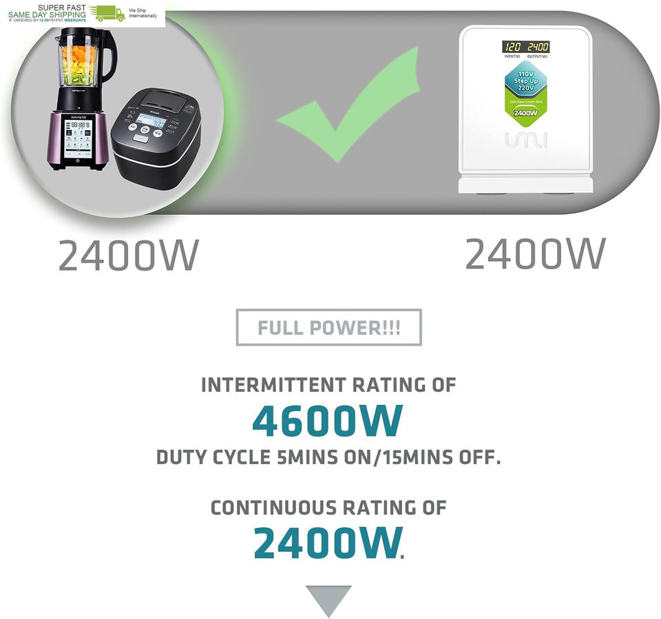 ?FULL POWER?Intermittent rating of 4600W - duty cycle 5mins on/15mins off. Continuous Rating 2400W. Unlike other compact converters or bulky voltage converter that stated 2000W can only work with 1600W appliance. Or stated 3000W, but can only work with 2400W. We say 2400W, then the power rating is 2400 watts, you can run your 2400W device continuously.