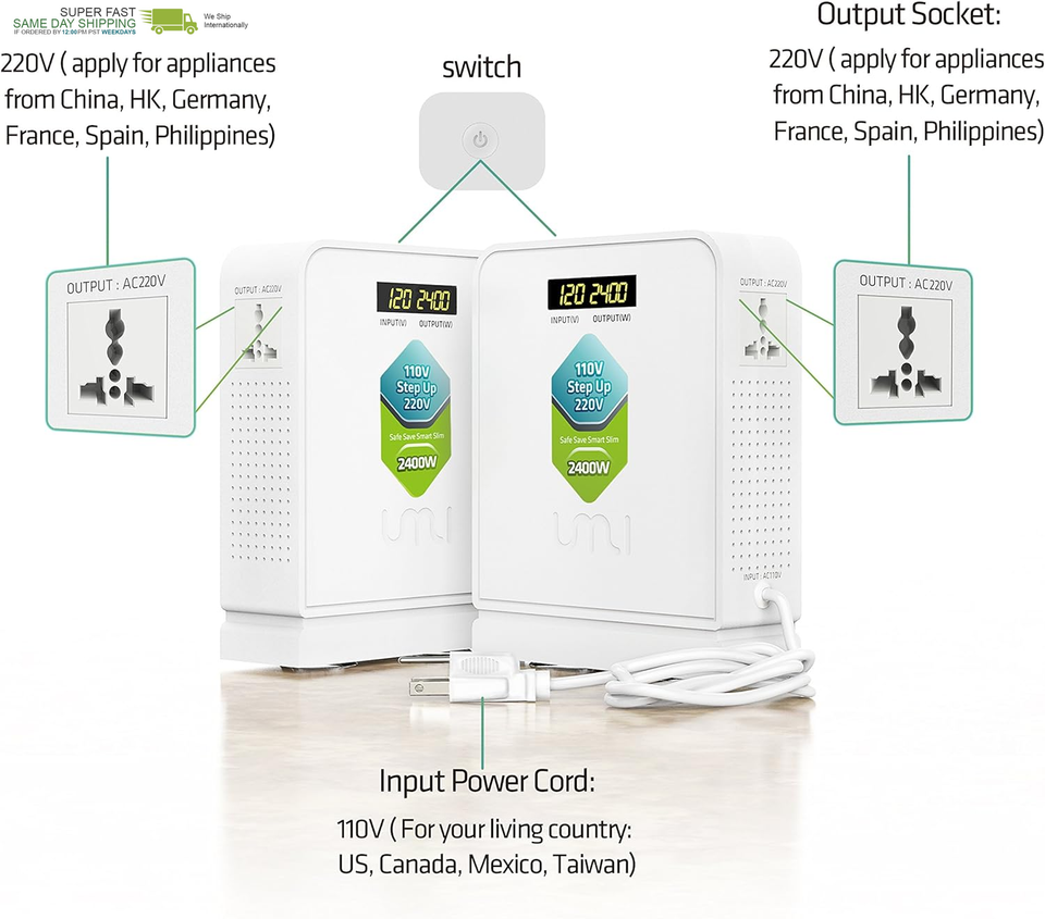 ?Power Transformer?Energy saving, quiet and high efficiency. With our UMI 2400 Watts Step Up Voltage Converter, you can use your UK, France, Germany, Italy, China, India, Vietnam and other countries 220v or 230v equipment in US 120v power system. Enjoy your life!