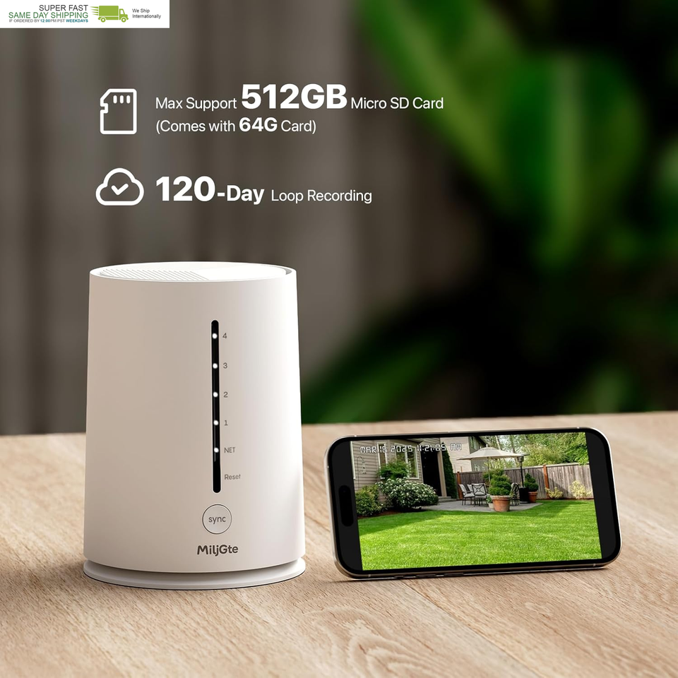 Storage Sharing: This wireless security camera is equipped with a 64GB TF card, which can provide up to 4 months of video loop recording. Equipped with a base station to ensure a more reliable network connection and enhance your overall user experience. Even if the camera is damaged or lost, the data is still safe and reliable. Therefore, you can easily save and view surveillance videos at any time. You can also share this solar security camera with your family and friends and enjoy the good times together.
