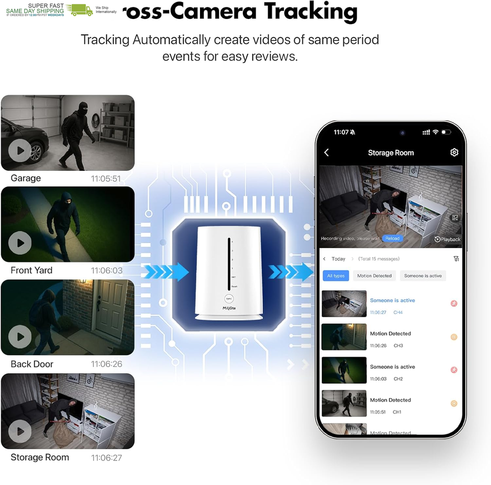 Cross-camera tracking: Home security cameras support automatic association of videos of events in the same time period, making it easy to view complete records. You can also watch live broadcasts of 4 areas on your phone at the same time, without missing any corner. Control the working status of multiple outdoor security cameras with one click to create a complete home wireless security camera system.