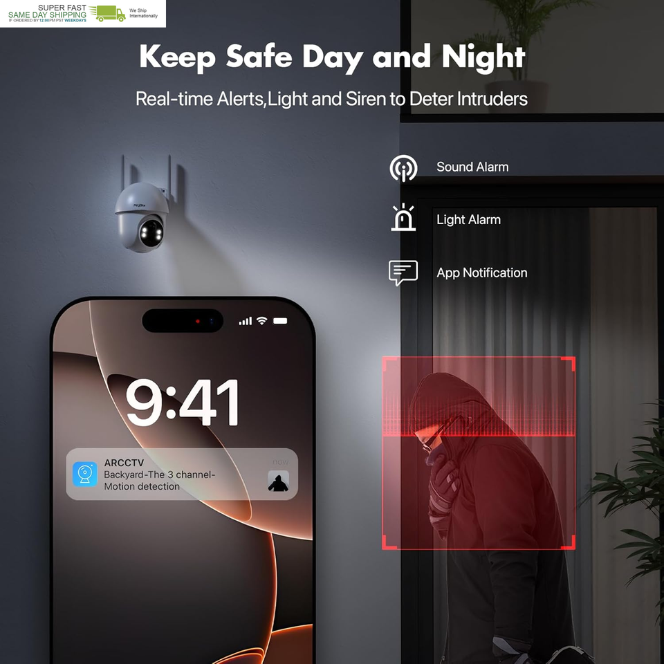 Two-way audio and sound and light alarm: With built-in microphone and speaker, you can communicate with family members near the security cameras wireless outdoor in real time, or drive away uninvited guests. At the same time, the surveillance camera has three alarm modes: sound alarm, light alarm and sound and light alarm, so you can always stay connected and in control.