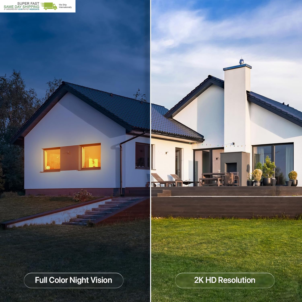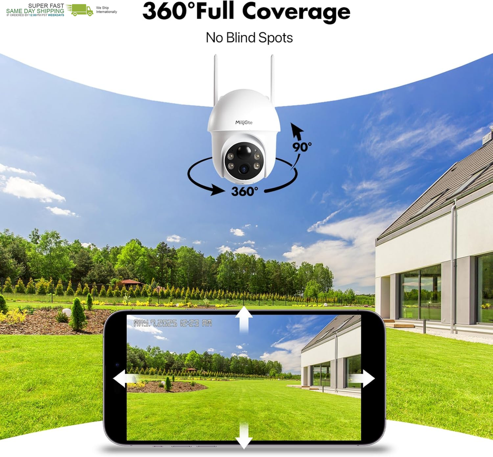 2k HD 360 Full Coverage: With clear 2K Full HD resolution, the outdoor camera wireless provides clear and sharp images and real-time video. Color night vision mode can present clear color images even in low-light environments.The security camera supports 355-degree horizontal rotation and 90-degree tilt rotation to capture a wider panoramic view with no blind spots, allowing you to see every detail in real time.