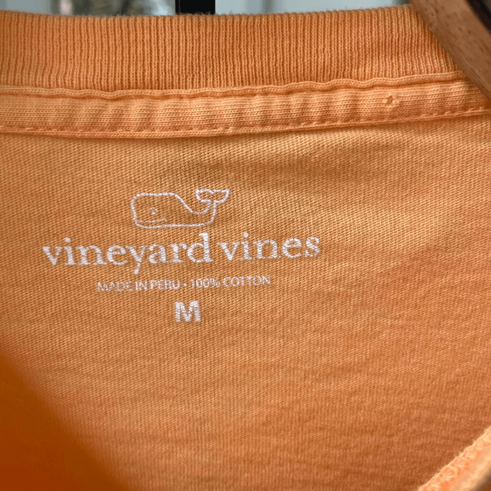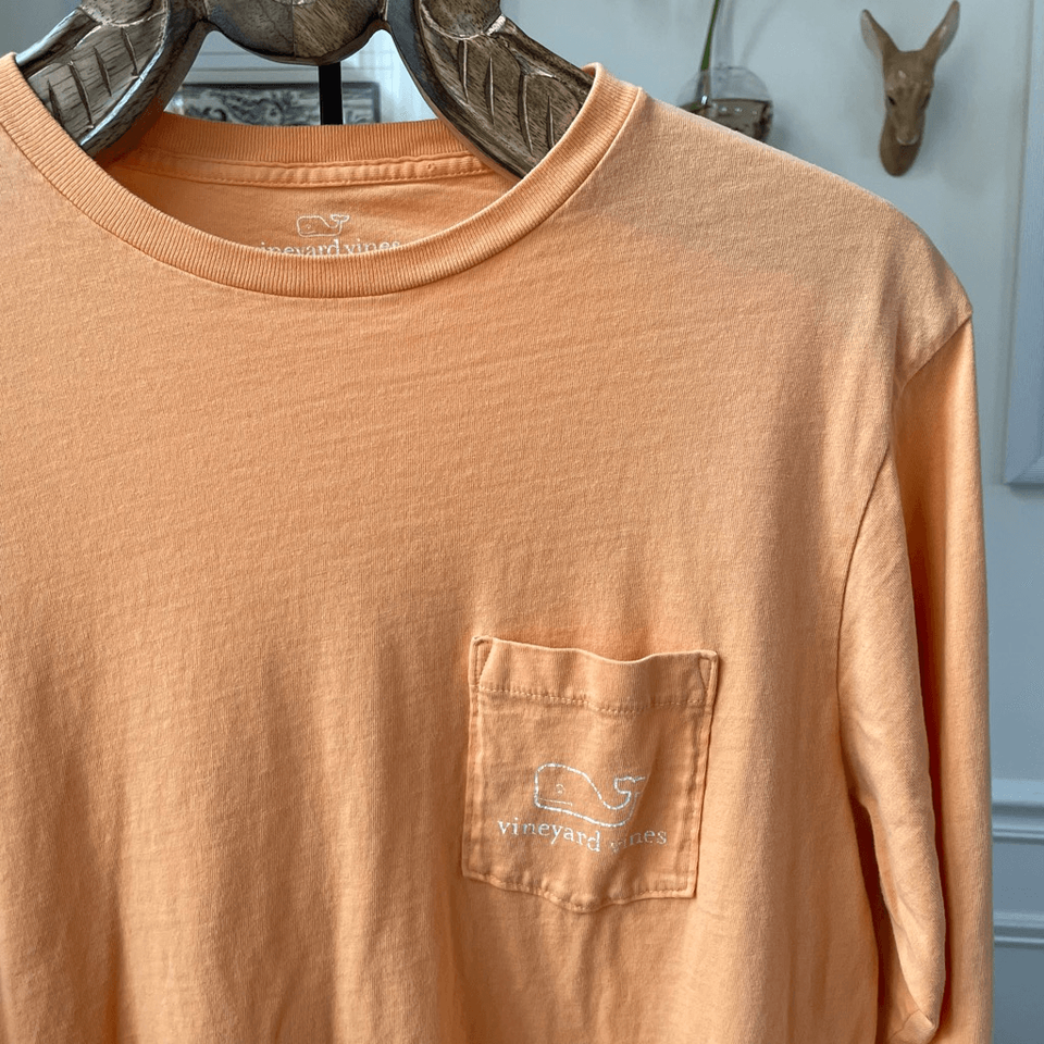 Men?s vineyard vines, long sleeve signature whale pocket T-shirt in orange sherbet. Well on the front pocket, print large across the back and vineyard vines printed down the length of one sleeve. 100% Pima cotton. Lay flat measures 28 inches shoulder to hem and 21 inches armpit to armpit.