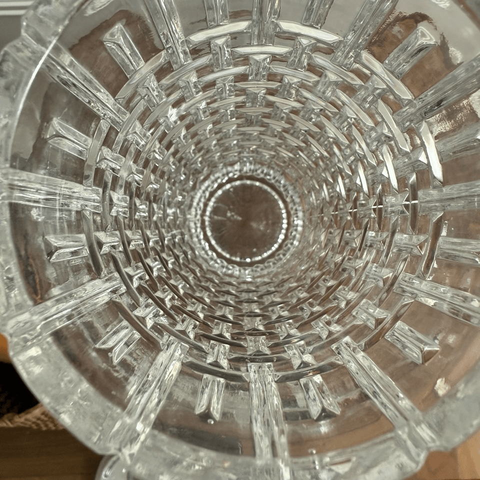 Vintage 70s Art Glass Crystal Vase by Jiri Repasek. 10?. The vase has a circular base and is processed in detail with a repeating square pattern. A wonderful example of post-Bauhaus decor.