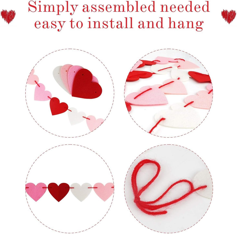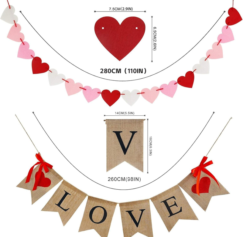 PERFECT VALENTINE'S DAY DECOR ? LOVE Burlap Size: 5 * 7-inch and 2.5 meters / 8.2 feet long. Each Felt Heart Garland Banner SIZE: 2.8 meter/ 9.2 feet for each.