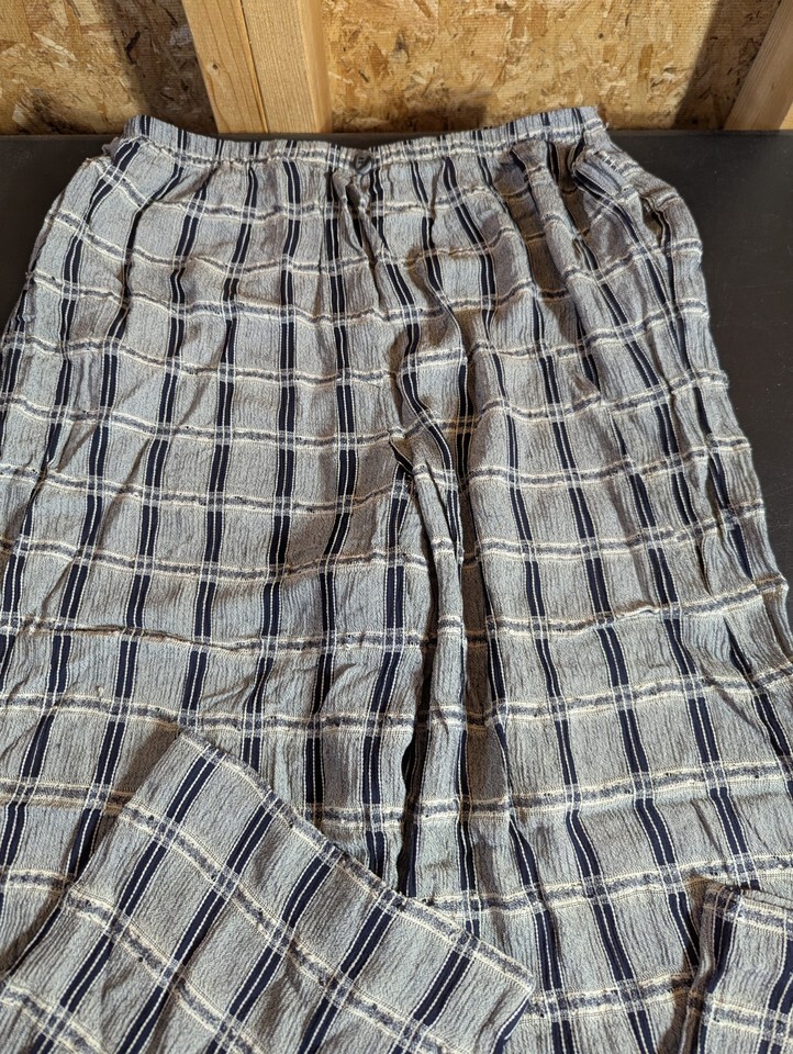 The Compagnie Internationale Express Size 10 Plaid Stretch Pants are vintage-inspired dress pants made from an acetate blend material. These black and gray pants feature a relaxed fit with a tapered leg style and a 26-inch inseam. Perfect for various occasions such as travel, parties, casual wear, and business events, these pants also have a drawstring closure and should be dry cleaned only. The pants are designed for a size 10 waist and are ideal for the warmer seasons of summer, fall, and spring, making them a versatile and stylish addition to any woman's wardrobe.
