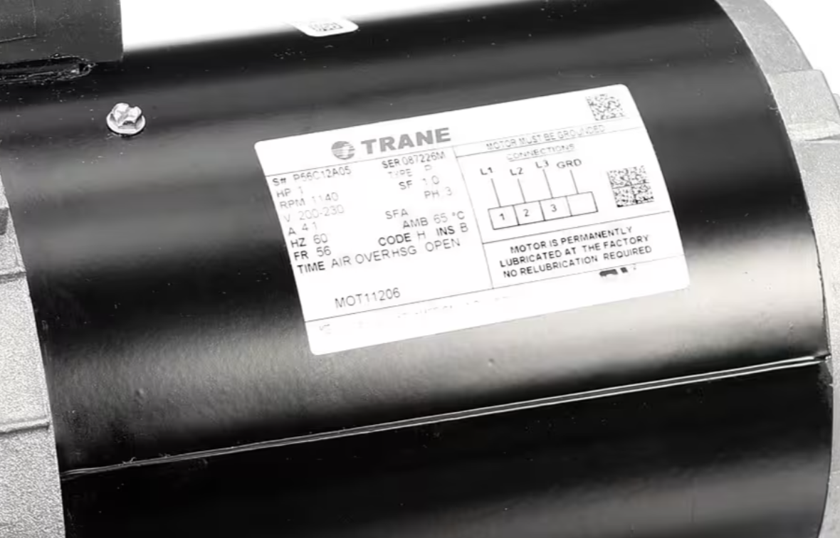Trane MOT11206, P56C12A05 Motor is a genuine OEM Trane three-phase HVAC motor engineered for reliable performance in commercial unitary systems. Operating on 200?230 volts at 60HZ, this motor delivers 1140 RPM with 1 HP output, providing consistent airflow and efficient operation. Built in a 56 frame, it is manufactured to Trane?s exact specifications and intended as a direct replacement to restore original system performance and durability.