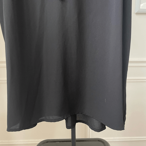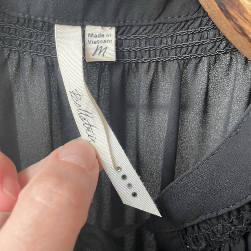 Bellatrix black 100% polyester with smocked shoulder and keyhole tie opening peasant style. Laying flat measures 25.5 inches shoulder to hem and 19 inches armpit to armpit.