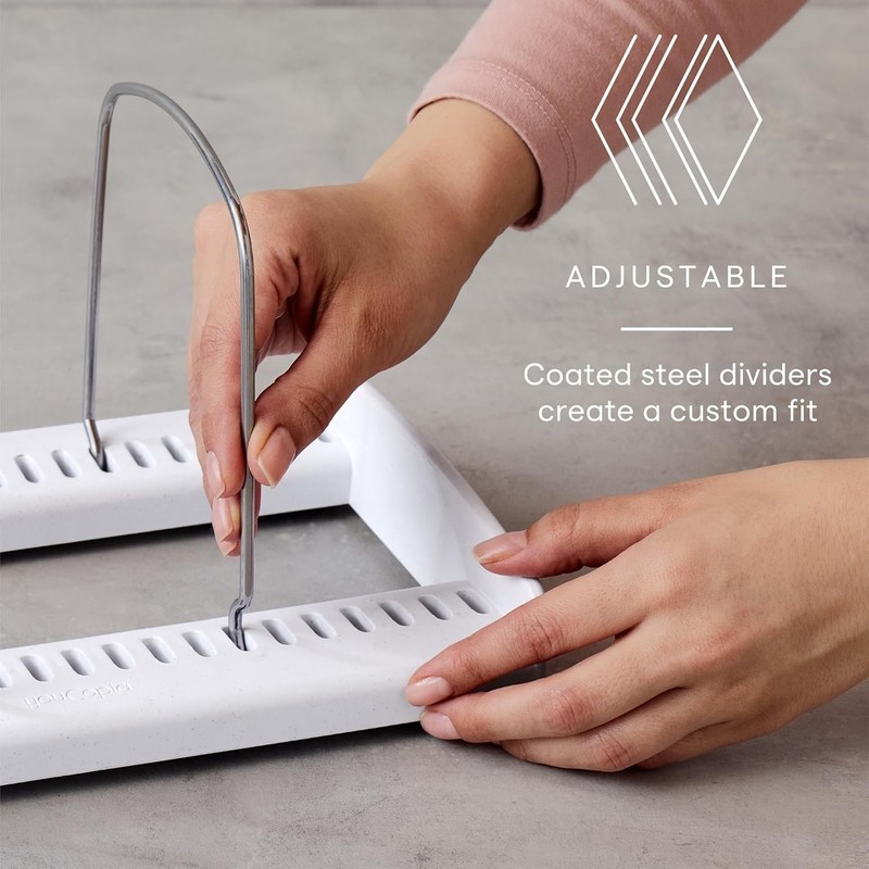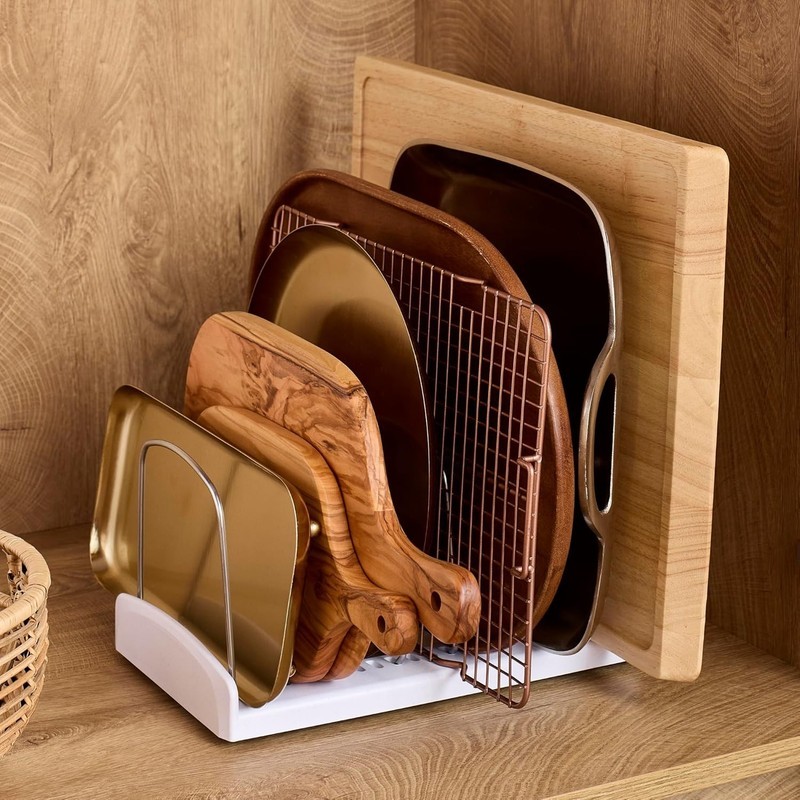 FLEXIBLE STORAGE: Seven (7) adjustable dividers organize pans, lids, cutting boards and cookie sheets in a lower cabinet, deep drawer or pantry. Dividers keep bakeware upright and separated, so you can always see and grab what you need.