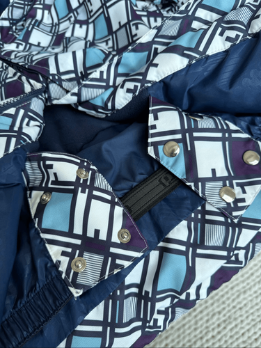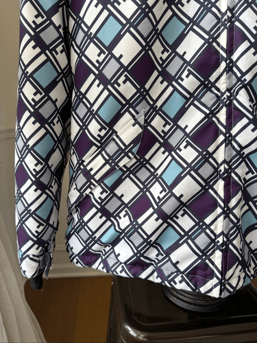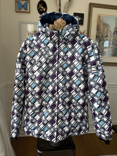 Women?s core powder room, ski or snowboard coat in abstract, black, white, turquoise and purple print. Flap Velcro pockets, removable hood, and under arm vents. Interior Snow system to attach your snow pants and waist toggle to prevent cold air creep. 5000mm. Tag size XL. Laying flat measures 28 inches shoulder to hem and 23 inches armpit to armpit.