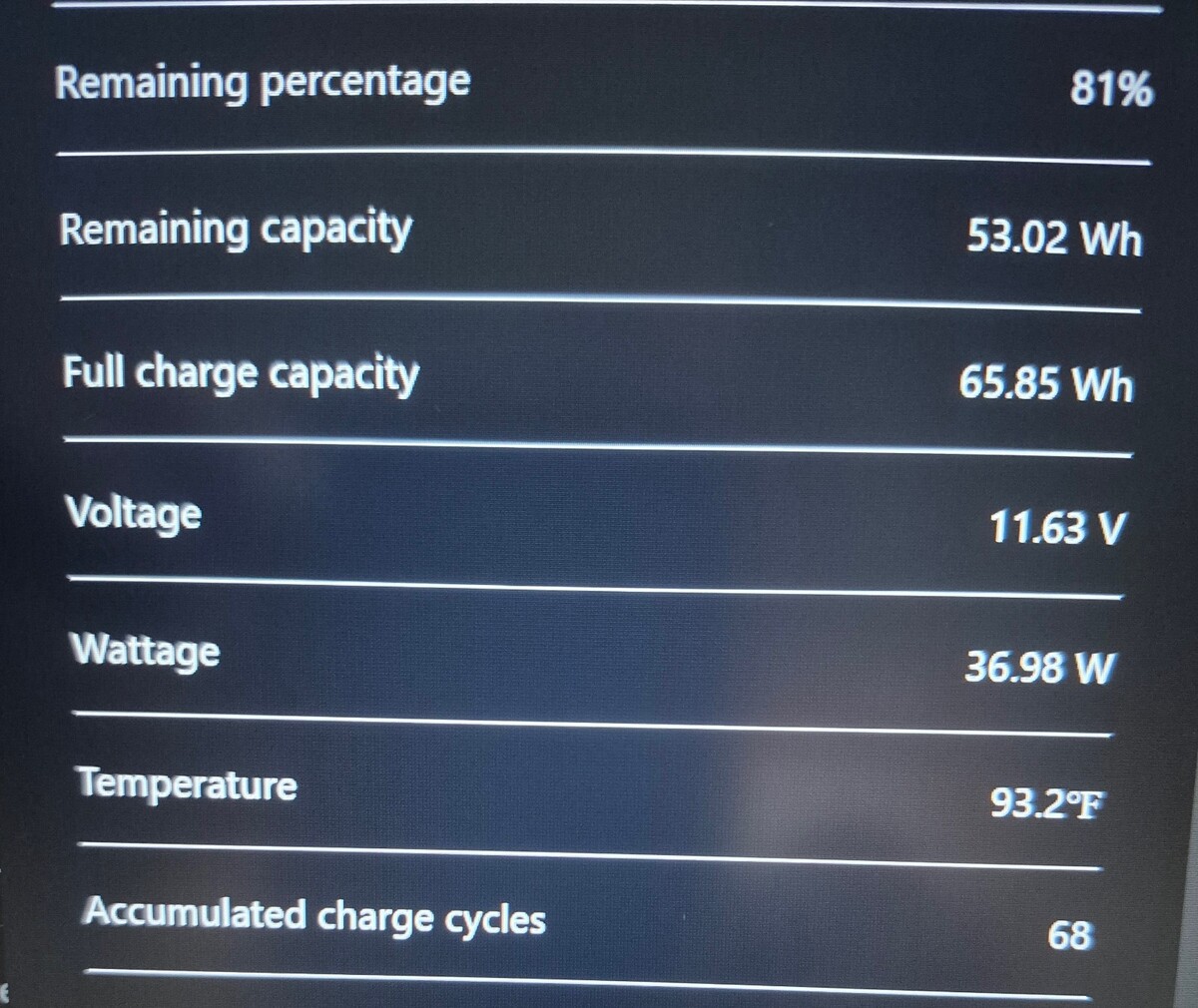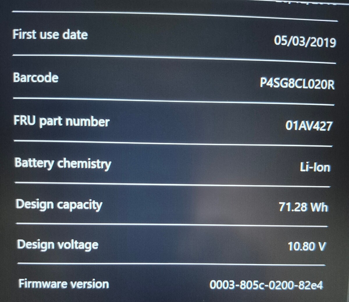 This battery is a Genuine Lenovo {not 3rd Party nor Aftermarket} was removed from a T480 that had a damaged Motherboard and was tested on another machine and the Lenovo Vantage App Battery Report showed Designed Capacity 71.10Wh ~ Full Charge Capacity 59.47Wh ~ 83% of Original Capacity left and Cycle Count 50 also shown is the last 5 digits of the serial numbers on the white bar code of the battery.