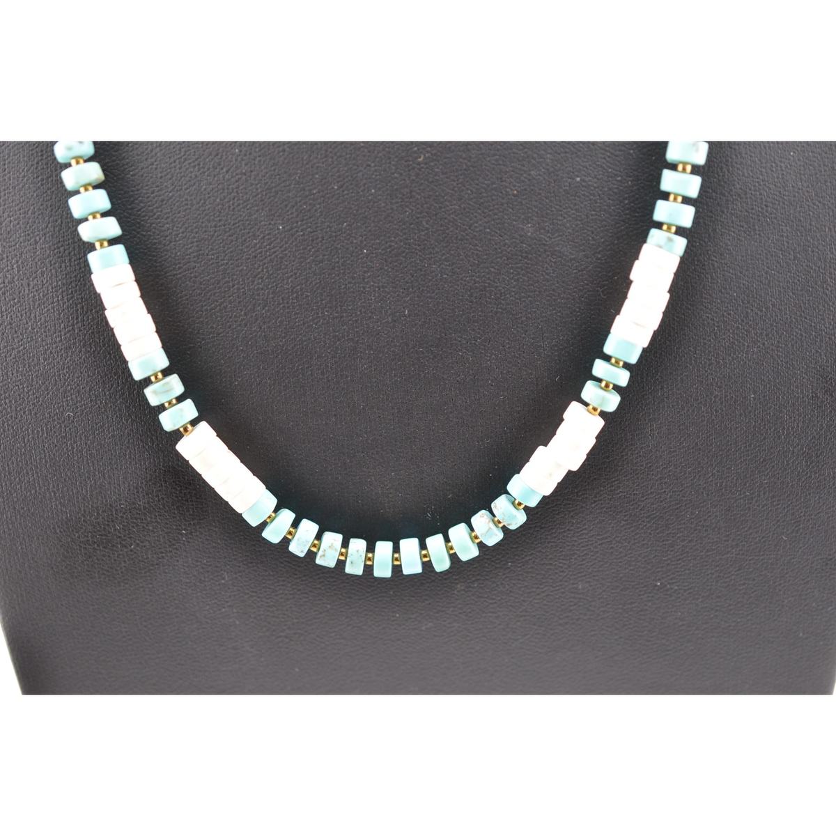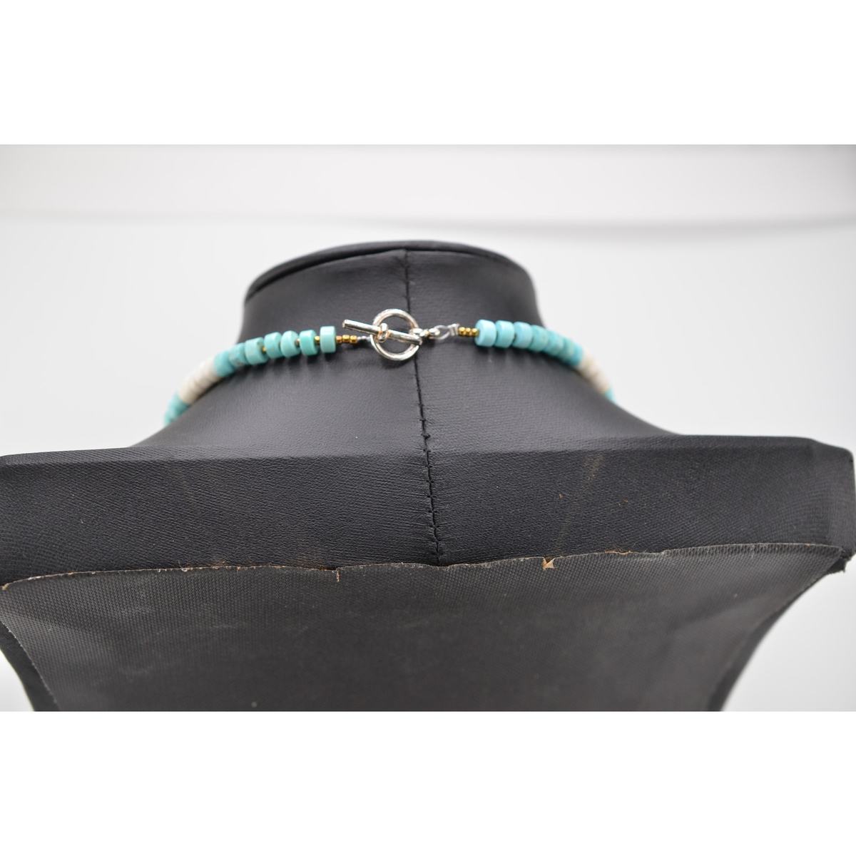 Blue Turquoise and natural White Buffalo Turquoise beads, 2x4mm. 20 inches in length. Hand made by Mary Winona Roanhorse who was taught by her Navajo grandmother to make beaded and other necklaces. Fun for layering or wear separately or give as a gift. A percentage of your purchase is donated to SWIWC.org assisting Native Women victims of domestic violence.
