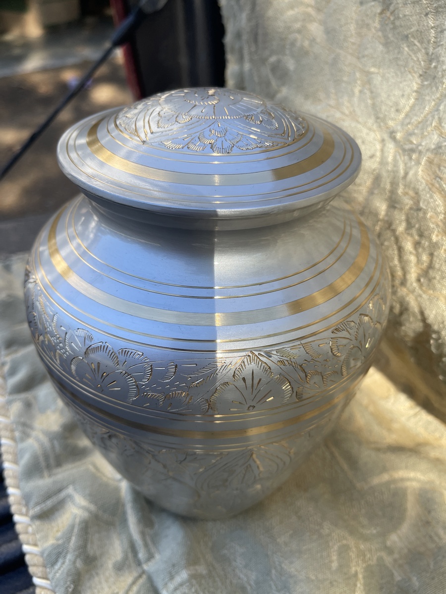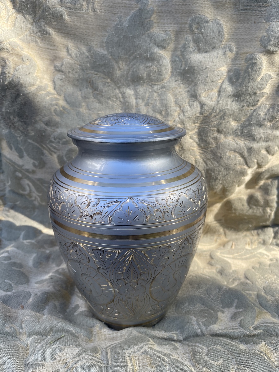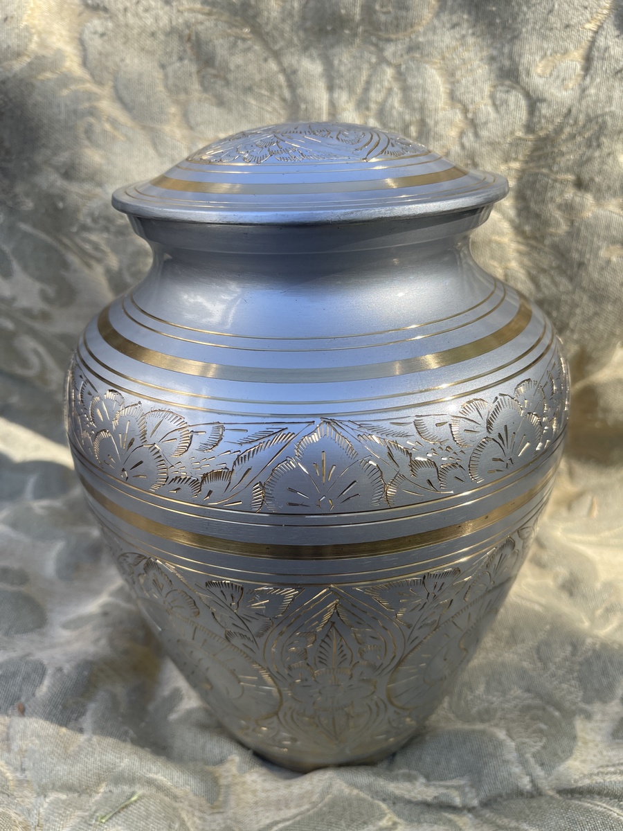 Pewter Finish Cremation Urn Ashes Etched Foliage Polished Brass Extra Large