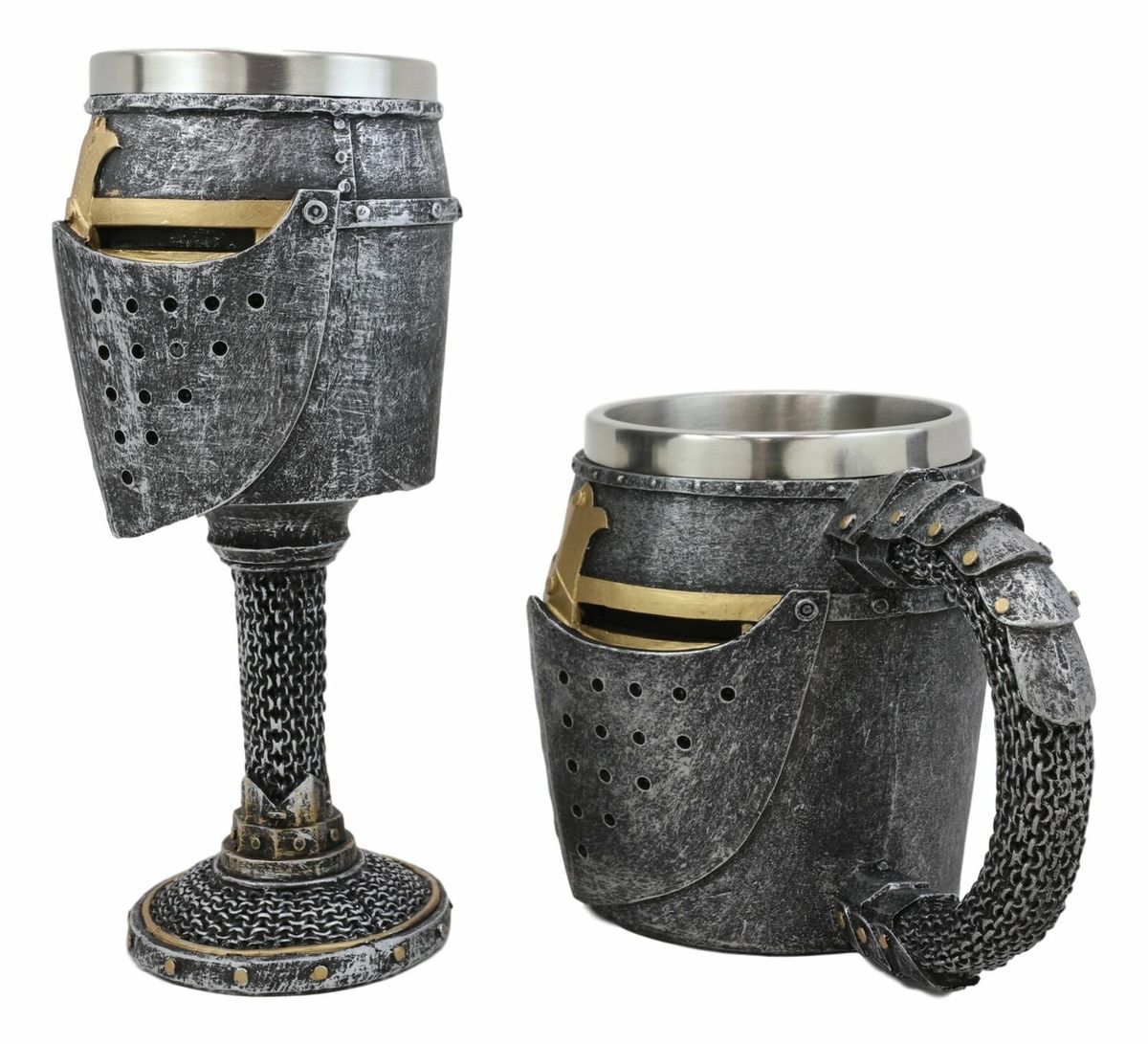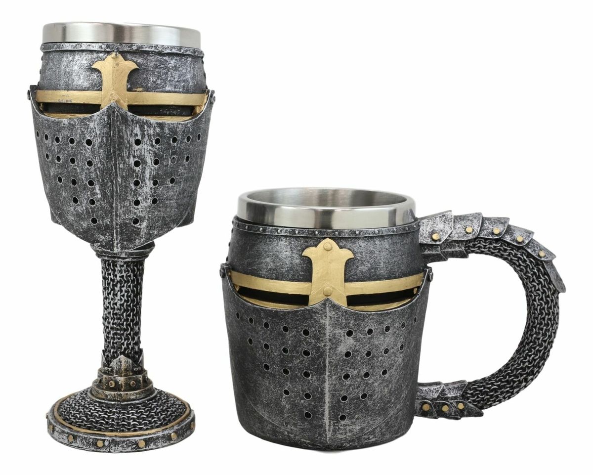 ? No matter what you are drinking, the final ingredient should always be a medieval knight suit of armor drinkware, because everything tastes better when it is sipped in medieval style. This stylish drinkware features a suit of armor knight's helm with a gold colored cross in the center. The stem/handle of the drinkware is sculpted in a Knight's chainlink armor, for better grip and design aesthetics. It is the perfect functional decor or gift for all fans of medieval knighthood.
