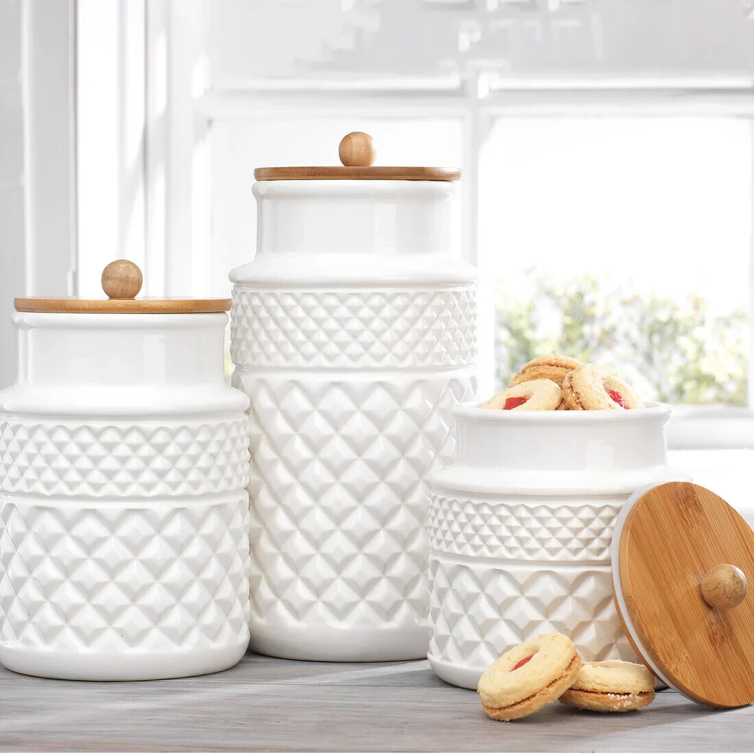 This set of 3 faceted ceramic canisters with sealed lids by Home Essentials is perfect for storing coffee, tea, and sugar in a stylish and farmhouse-themed way. The round canisters feature a white color and stand at a height of 7.5 inches. Each canister has a lid to keep your items fresh and organized, making it a practical and decorative addition to your kitchen storage and organization.