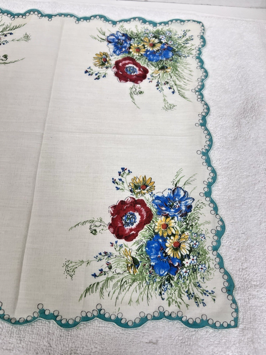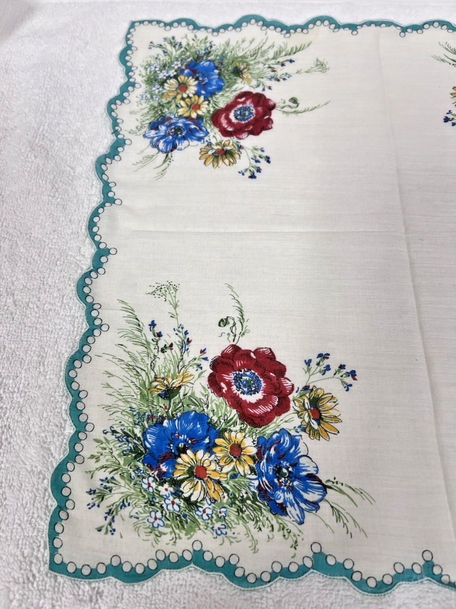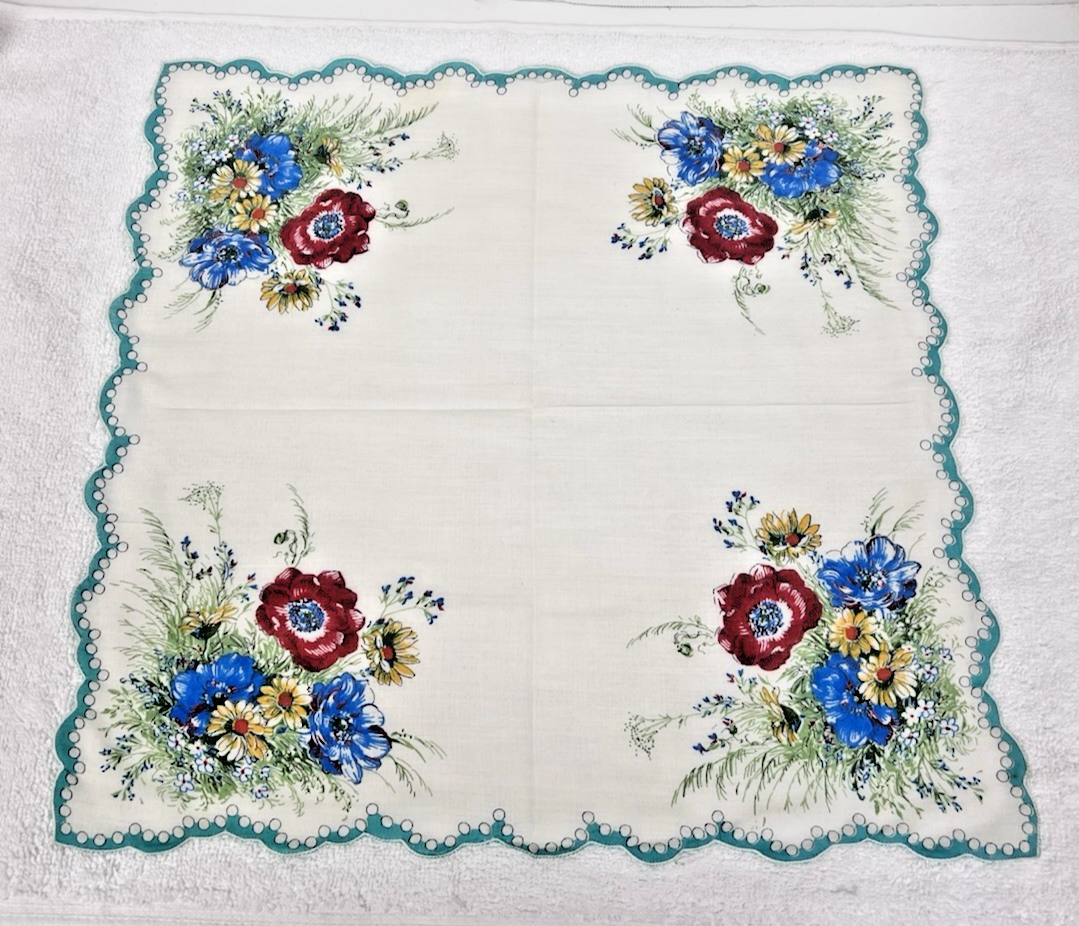 Vintage White Cotton Floral Wildflower Yellow Daisy Red Blue Anemone Bluebells Scalloped Border Handkerchief Approx. 13 1/2". Very nice condition, no damage/tears, colors bright.