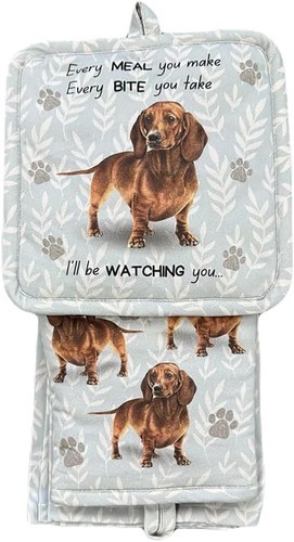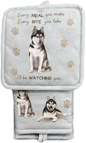 3-PIECE KITCHEN SET: Includes a heat-resistant oven mitt (7.5 x 14 in), a cotton-lined pot holder (8 x 8 in), and a kitchen towel (18x26 in), all featuring adorable dog and cat breed prints.