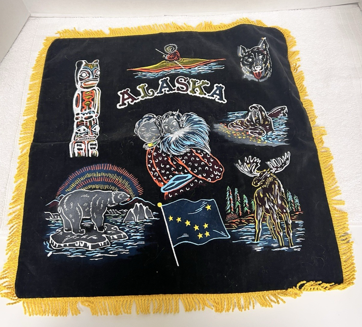 Vintage Japan Made Alaska Souvenir Painted Black Velvet Pillow Cover Fringe MCM Moose Bear Totem Eskimo Canoe Flag Dog Sealion 17". Very good condition, no tears I find, colors bright intact.