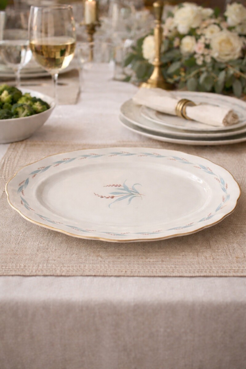 Vintage oval serving platter produced by **Korona** in Poland. The platter features a soft cream ground with a delicate floral and leaf motif in muted blue, teal, and dusty rose tones, accented by a scalloped rim with gold trim. A classic mid-century European design well suited for traditional, cottage, or vintage table settings.