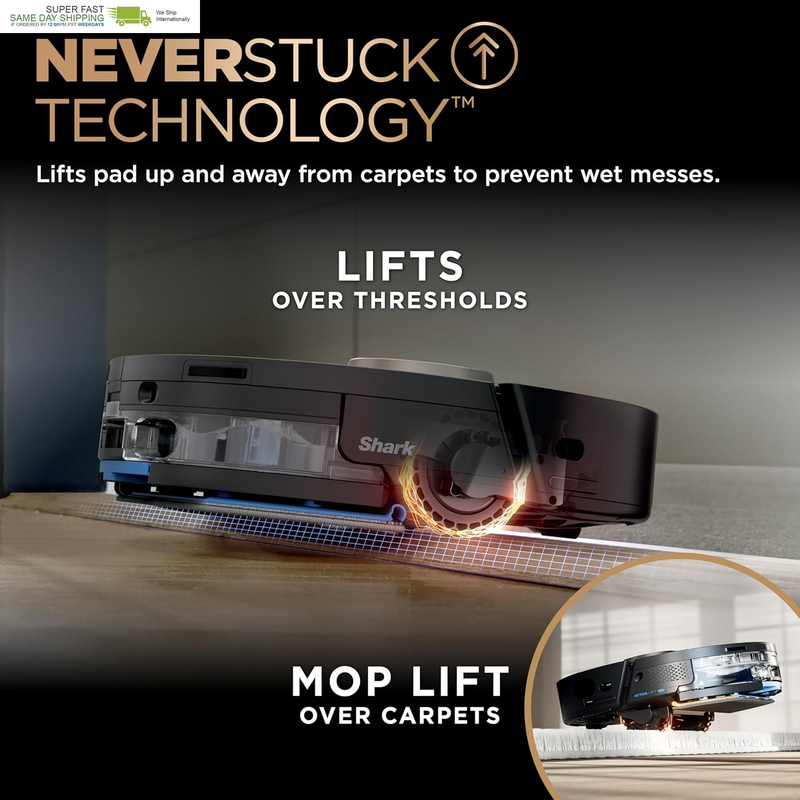 UP TO 2X BETTER CLEANING COVERAGE*: With NeverStuck Technology, the robot lifts itself over obstacles and across thresholds. When mopping, it keeps the pad above carpets to prevent wet messes and deliver whole-home coverage. (*vs. Shark ION).