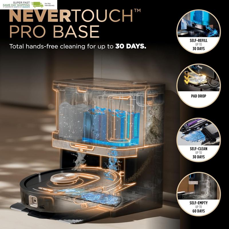 The PowerDetect NeverTouch Pro robot vacuum and mop is designed to capture more, reach farther, and need you less (vs. Shark Matrix 2-in-1.) After every cleaning run, the robot will return to the NeverTouch Pro base to empty debris, refill the water tank, and wash and dry the mopping pad so it?s always ready for its next clean?maintenance-free cleaning for up to a month.