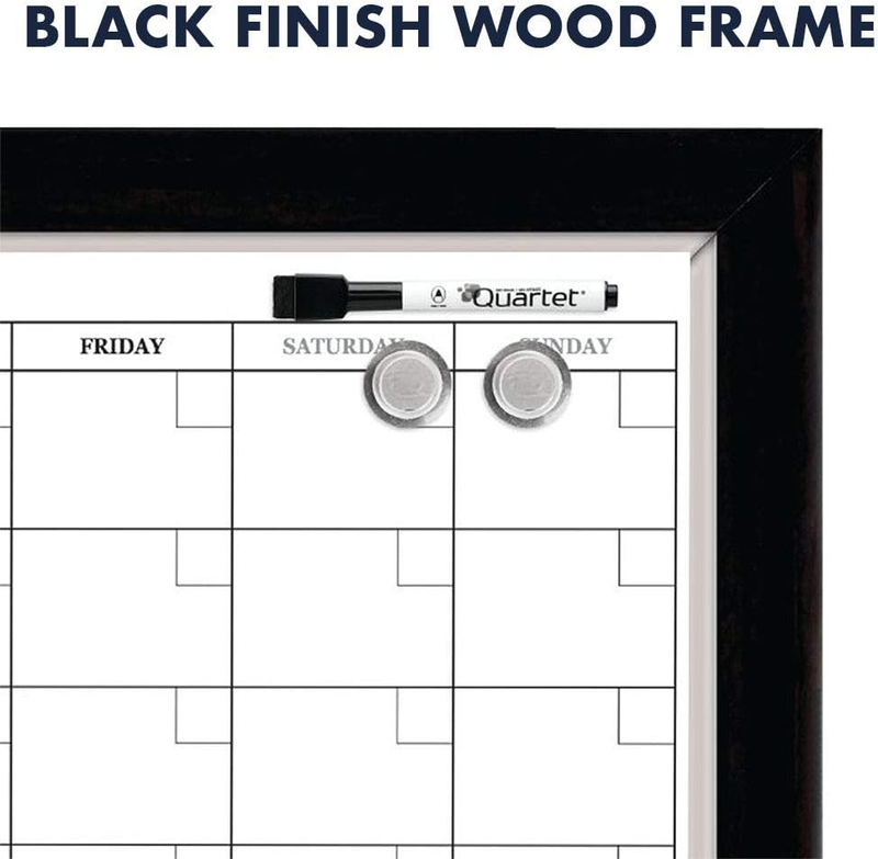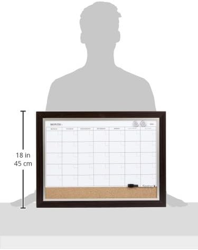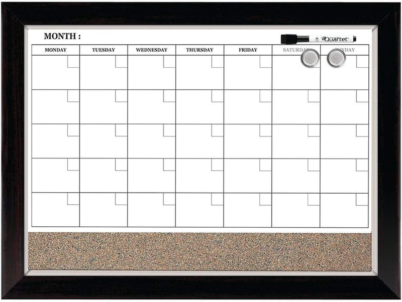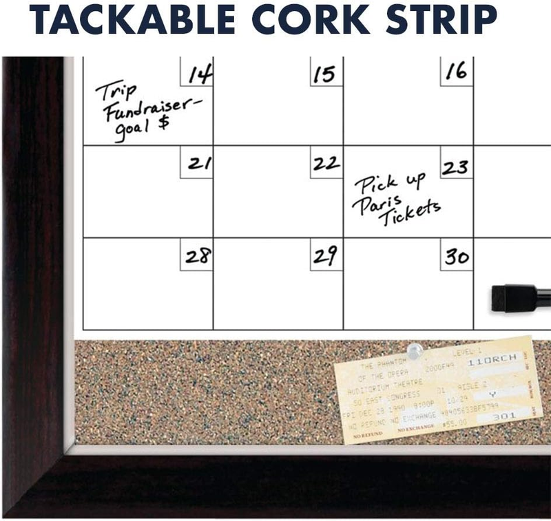 All-in-one dry-erase calendar, magnetic bulletin board, and cork bulletin bar combo board measures 17" x 23". The stylish, espresso champagne wood finish frame prevents the calendar board from sticking out in a living space, kitchen or dorm room. Stylish, 17" x 23", two-tone espresso champagne wood finish frame calendar combo board boast dual functionality. Magnetic dry-erase surface can be used to track dates and appointments, while the cork strip across the bottom can be used to tack up photos and papers. Small items could also be hung from the dry-erase surface with magnets. Dry-erase board is pre-printed with a reusable one month calendar grid. You draw in the dates, which allows the board to be reused month after month. Mounting hardware, Quartet dry-erase marker and magnet accessories are included. 60-day warranty.Orientation: Horizontal.