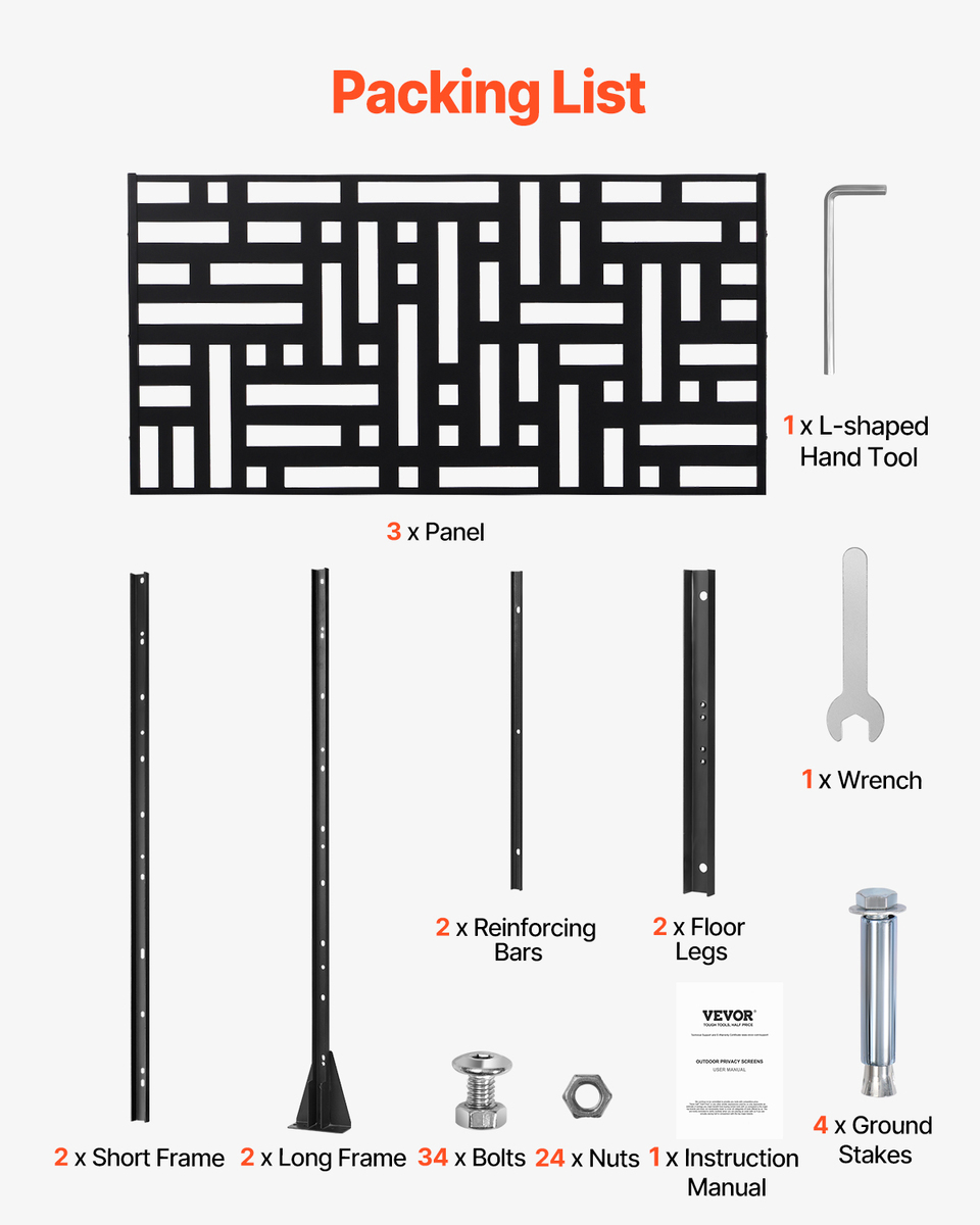 What's Included: The package includes 3 panels, 2 short frames, 2 long frames, 2 base feet, 2 reinforcing bars, 34 bolts, 24 nuts, 1 wrench, 1 l-shaped tool, 4 ground stakes, 1 instruction manual.