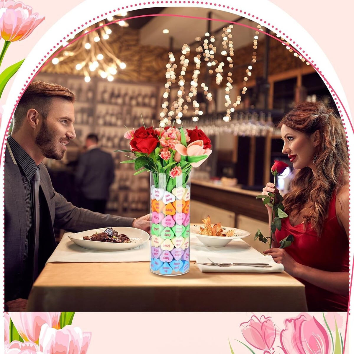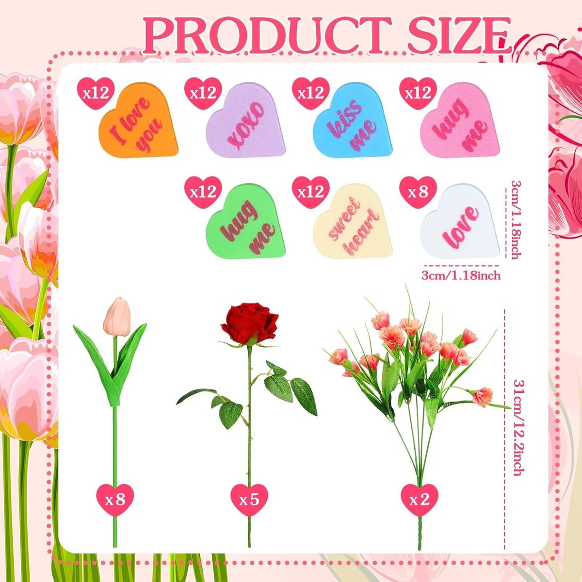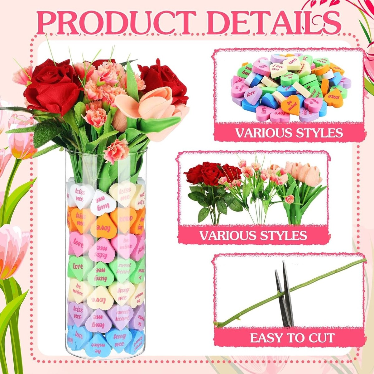 Quality Materials: the artificial rose and carnation petals and leaves boast fine silk, making them look stunningly real, while the surface of the fake rose stem is out of plastic; The interior is kept in shape by wire; Our vase filler hearts and artificial tulips, unlike ordinary fabric ones, are made of soft PVC material, adding a touch of authenticity to your Valentine's Day decor
