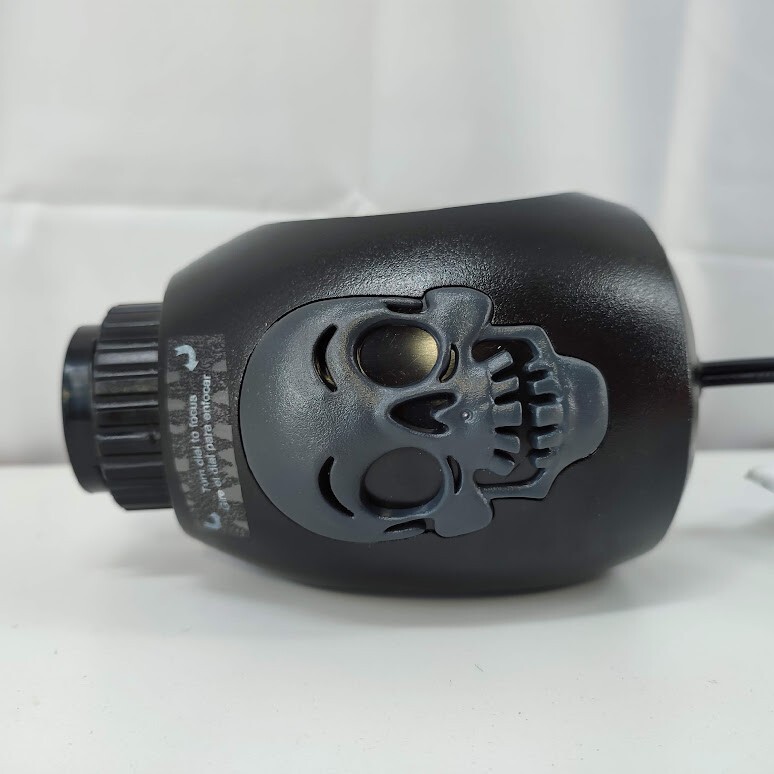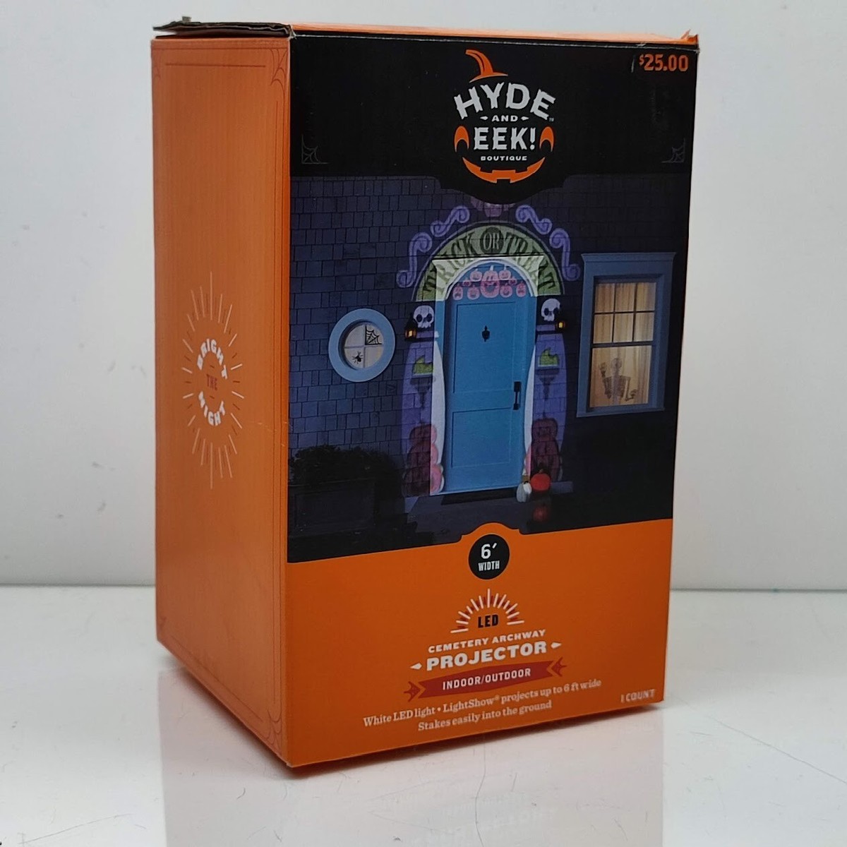 Project a frightfully festive scene over a door with the LED Trick or Treat Cemetery Archway Halloween Lightshow Projection from Hyde EEK! Boutique?. The spotlight with long-lasting LED bulbs projects the image of an archway with pumpkins, skulls, torches and the words ?Trick or Treat.? You can use this fun lightshow projection indoors or out, and the spotlight projects up to 15 feet away with the help of a 72-inch cord