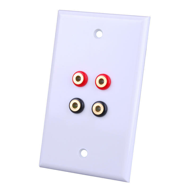Color: White. Material: Aluminum. Switch Style: Coaxial. Color: White. Use this wall plate to connect audio speakers. This wall plate accepts banana plugs.