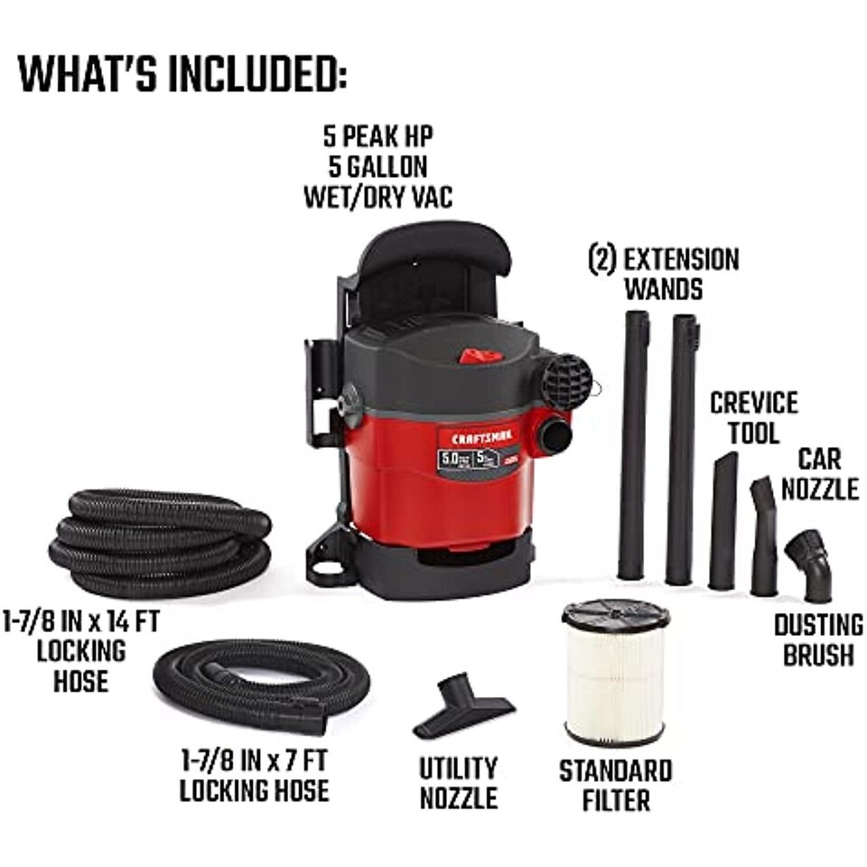 WHAT'S INCLUDED: (1) Wet/Dry Wall-Mountable Vacuum, (2) Locking Hoses (1-7/8 in. x 7 ft. and 1-7/8 in. x 14 ft.), (1) Utility Nozzle, (1) Crevice Tool, (1) Car Nozzle, (1) Dusting Brush, (2) Extension Wands and (1) Standard Filter