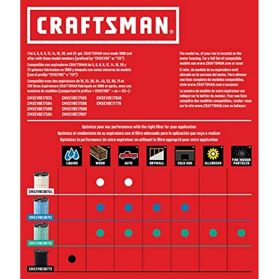 COMPATIBLE FILTERS: CMXZVBE38751, CMXZVBE38753, CMXZVBE38754, CMXZVBE38773, CMXZVBE38755, CMXZVBE38776, CMXZVBE38777, CMXZVBE38778, and CMXZVBE38779 Genuine CRAFTSMAN Vac Filters