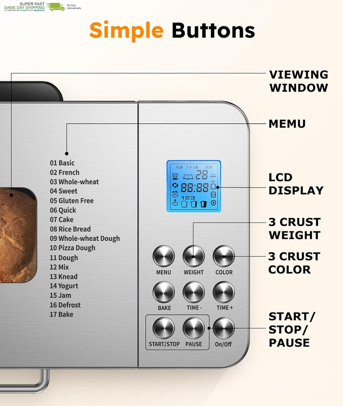 17 CUSTOMIZABLE PROGRAMS: Our bread machine features 17 customized automatic programs to fit all your baking needs and preferences. Whether you're making a basic loaf, cake,whole wheat, jam, yogurt or gluten-free bread, it?s designed to give you perfect results every time