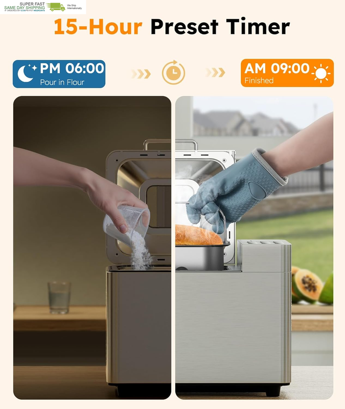 15-HOUR DELAY TIMER KEEP WARM: Set the timer up to 15 hours in advance for fresh bread waiting for you in the morning or after a long day. The keep-warm function ensures your bread stays at the perfect temperature for up to an hour after baking