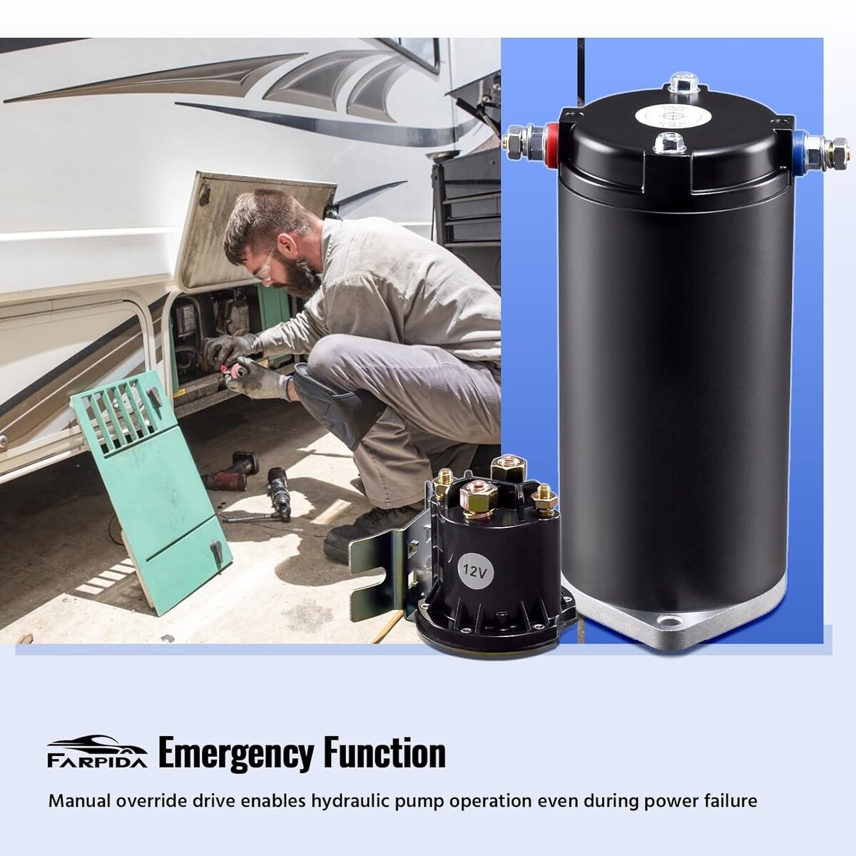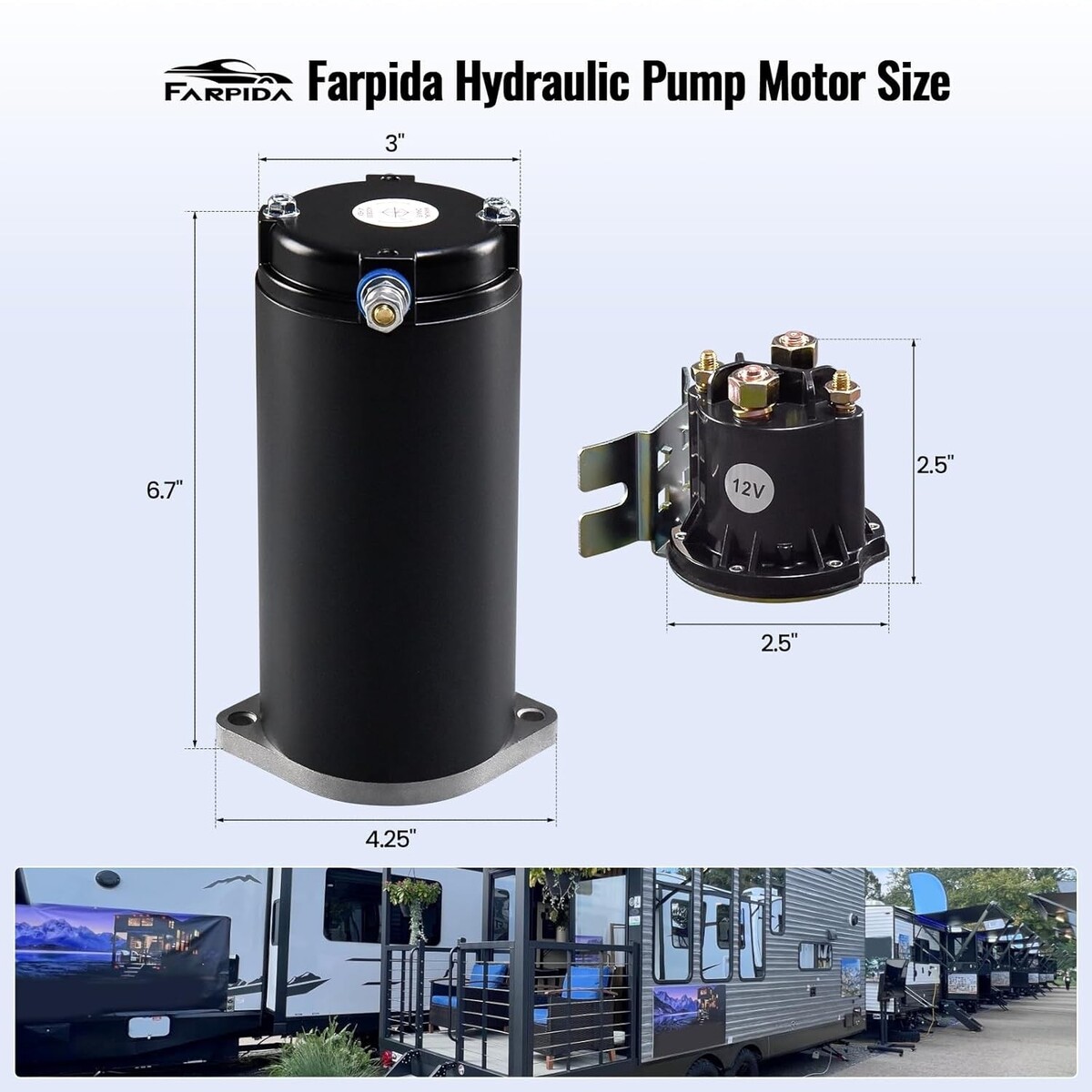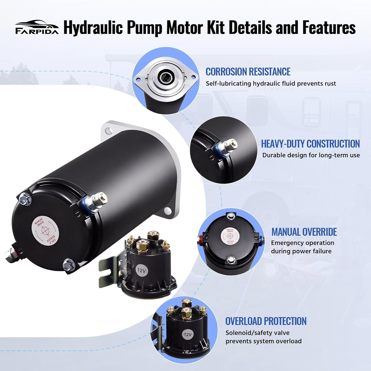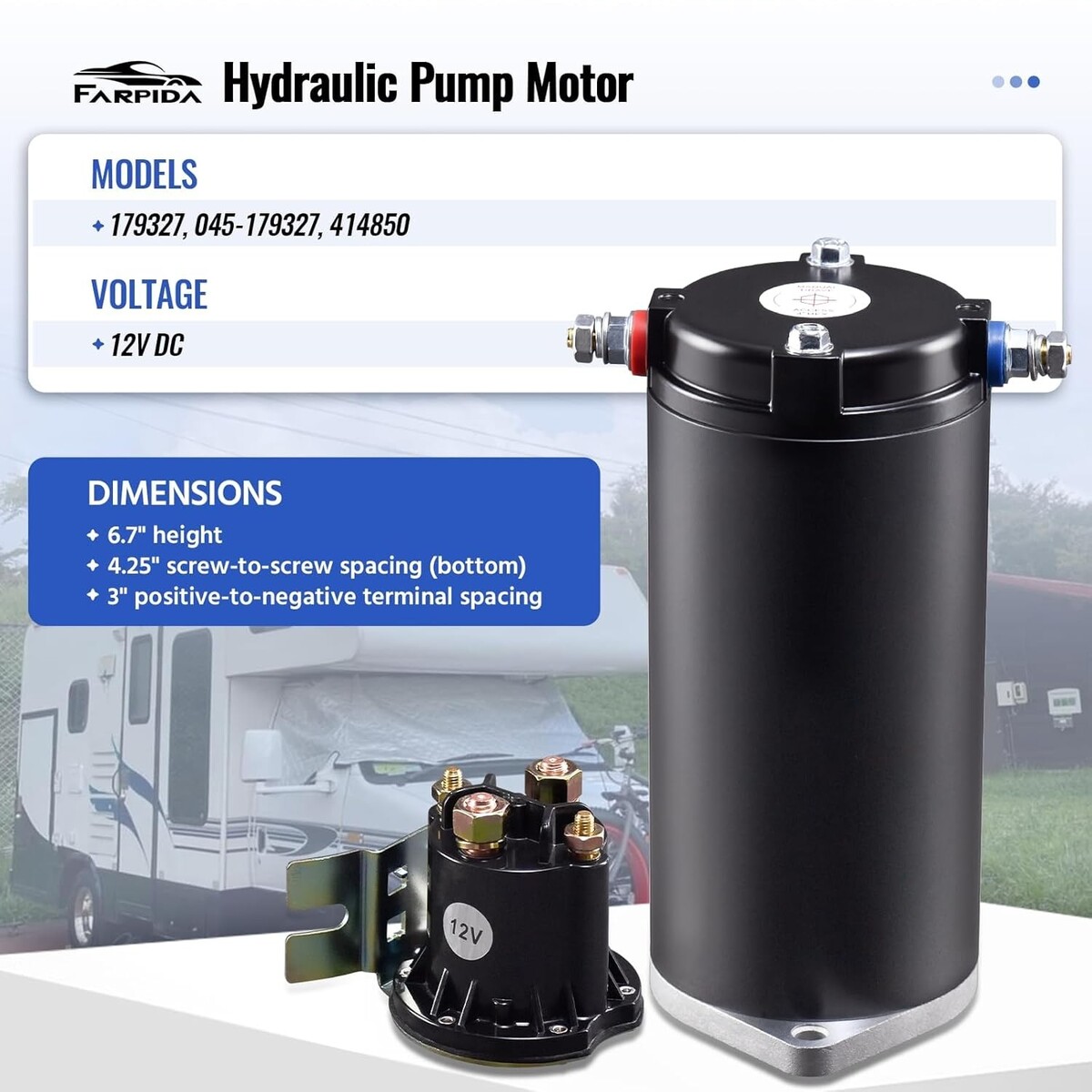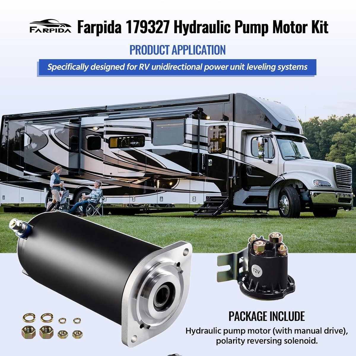 ?Function Benefits? Farpida hydraulic leveling system kit for RVs includes a pump motor with manual drive and a solenoid. It is designed for unidirectional power unit leveling systems. Robust and efficient, the 179327 hydraulic pump motor provides consistent force to drive heavy-duty machinery with precision, help your caravan rise smoothly and adjust to the appropriate height