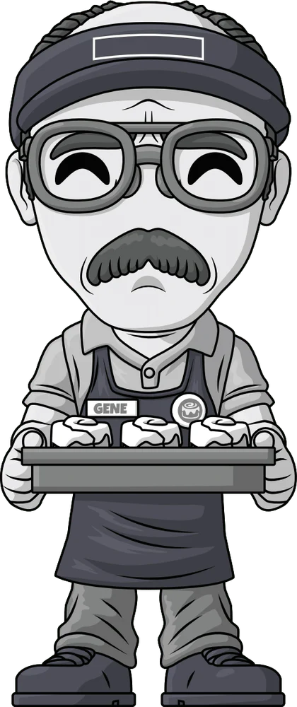 Gene stands at 4.7 inches tall and is offering you a tray of freshly baked cinnamon rolls. Behind his styled moustache there is a slight scowl as his eyebrows furrow at his forehead. He is dressed in a full workers uniform with a short-sleeved dress shirt and pants. On top he is wearing an apron that has his name tag on his right side and the cinnamon roll logo on the left. This full monochrome colored figure is complete with his glasses and a uniform visor that rests on top of his head. The exterior of the windowed display box has been illustrated to show a black and white scene of a dessert shop with Gene rolling out some dough. The interior of the box has a bright yellow background with "Better Call Saul" logo in red. This collectible was designed in collaboration with @ReyButYoutooz and ships in a matte, embossed, protective outer sleeve and a custom-sized plastic protector for maximum protection during shipping.