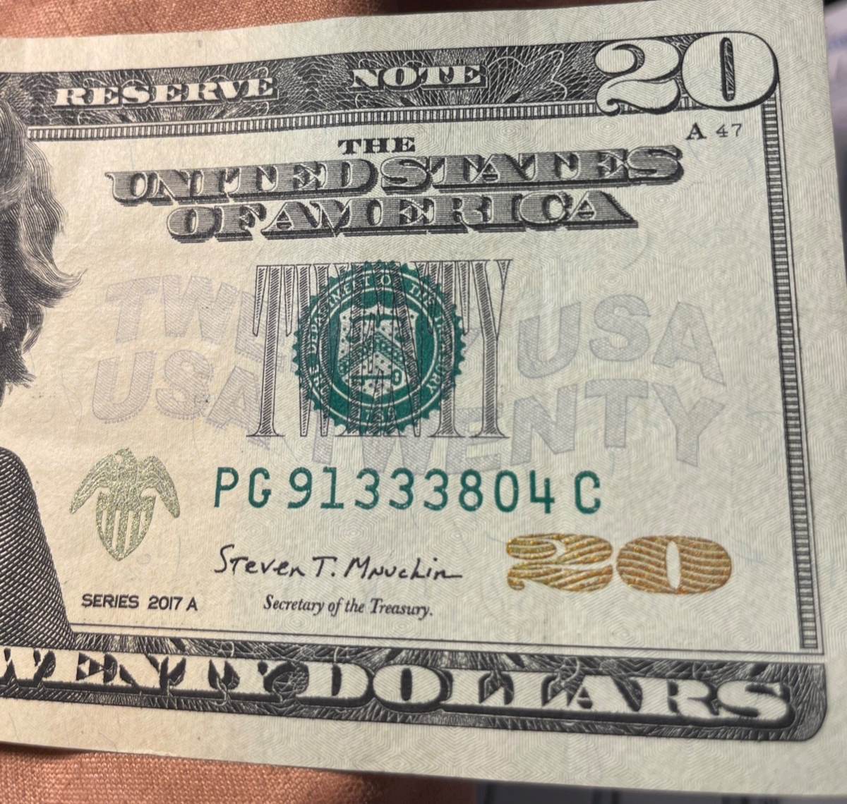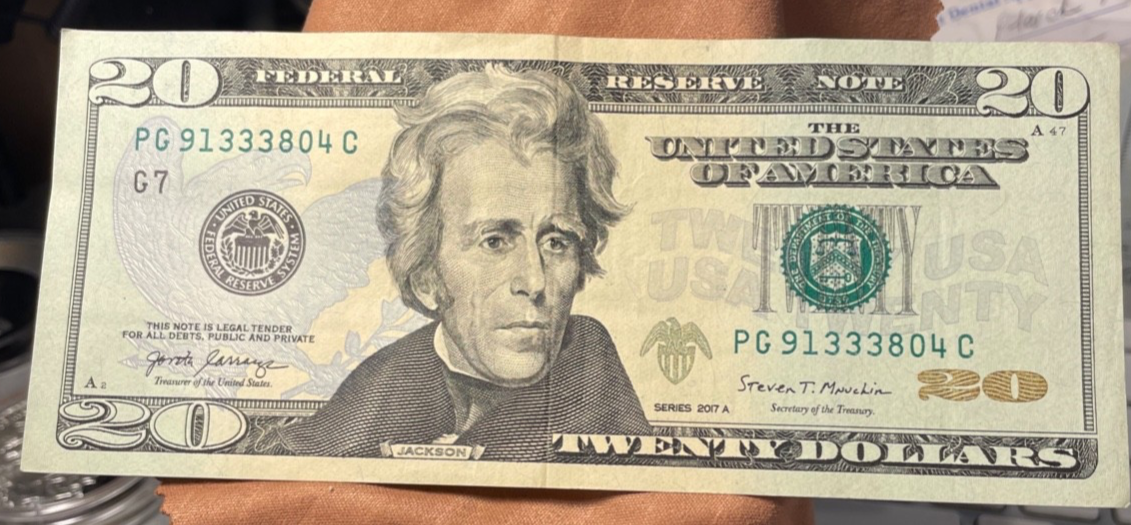 The product is a circulated $20 Banknote from the United States, specifically from the Federal Reserve. The note is from the year 2017 and features triple 3s in its serial number (#PG 91333804). It is uncertified and in ungraded condition, with an apparent/net grade designation. The note falls under the category of Federal Reserve Notes:Small Size Notes:Paper Money: US:Coins Paper Money.