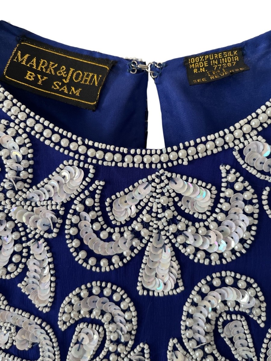 Vintage Mark & John by Sam Royal Blue Beaded Silk Evening Top Formal Blouse