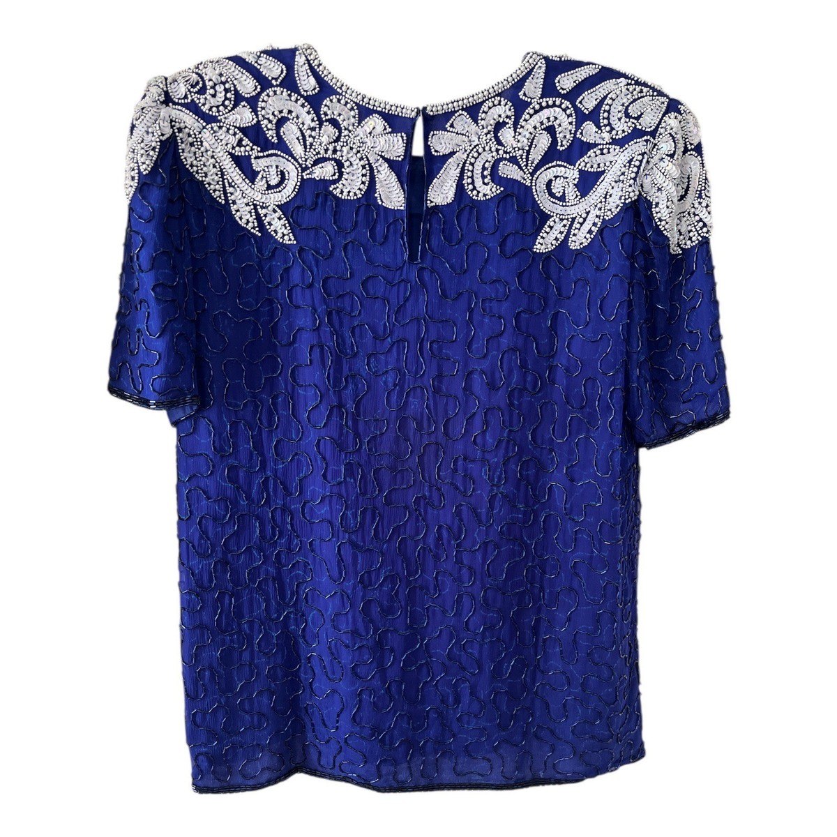 Elegant vintage evening top by Mark John by Sam, crafted in rich royal blue silk with intricate hand-applied bead and sequin embellishment across the neckline and shoulders. The body features subtle stitched texture throughout, with short sleeves and a graceful drape. Fully lined for comfort and structure, this is a timeless special-occasion blouse suited for cocktail events, holidays, or formal wear.