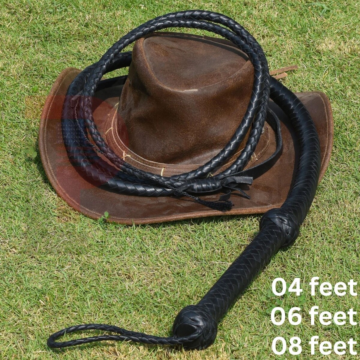 This is a handmade black leather stock whip made from cowhide leather. The whip features a 12-plait overlay with a rope core construction. Length options include 4 ft, 6 ft, and 8 ft.